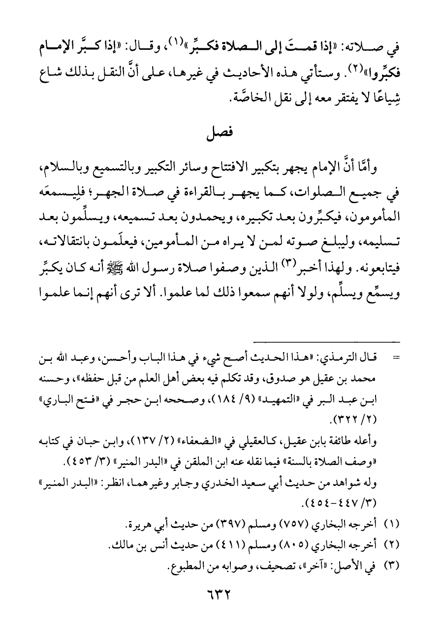 وأمَّا أنَّ الإمام يجهر بتكبير الافتتاح وسائر التكبير وبالتسميع وبالسلام, في جميع الصلوات, كما يجهر بالقراءة في صلاة الجهر؛ فلِيسمعَه المأمومون، فيكبِّرون بعد تكبيره, ويحمدون بعد تسميعه, ويسلِّمون بعد تسليمه, وليبلغ صوته لمن لا يراه من المأمومين، فيعلَمون بانتقالاته، فيتابعونه. ولهذا أخبر (¬٣) الذين وصفوا صلاة رسول الله - صلى الله عليه وسلم - أنه كان يكبِّر ويسمِّع ويسلِّم, ولولا أنهم سمعوا ذلك لما علموا. ألا ترى أنهم إنما علموا