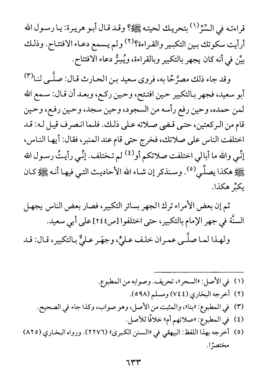 قراءته في السِّرِّ (¬١) بتحريك لحيته - صلى الله عليه وسلم -؟ وقد قال أبو هريرة: يا رسول الله أرأيت سكوتك بين التكبير والقراءة؟ (¬٢) ولم يسمع دعاء الافتتاح. وذلك بيِّن في أنه كان يجهر بالتكبير وبالقراءة, ويُسِرُّ دعاء الافتتاح.