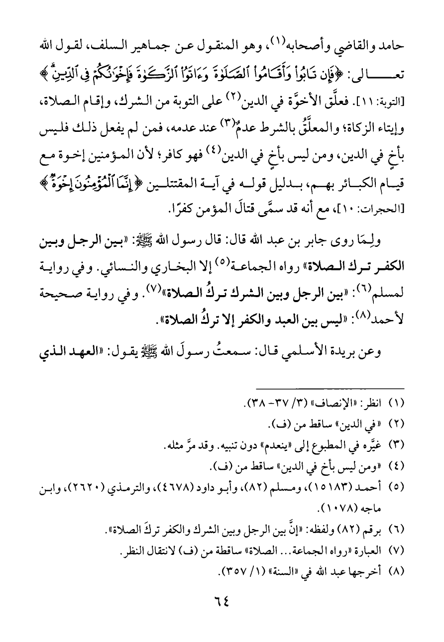 ولِمَا روى جابر بن عبد الله قال: قال رسول الله - صلى الله عليه وسلم -: «بين الرجل وبين الكفر ترك الصلاة» رواه الجماعة (¬٥) إلا البخاري والنسائي. وفي رواية لمسلم (¬٦): «بين الرجل وبين الشرك تركُ الصلاة» (¬٧). وفي رواية صحيحة لأحمد (¬٨): «ليس بين العبد والكفر إلا تركُ الصلاة».