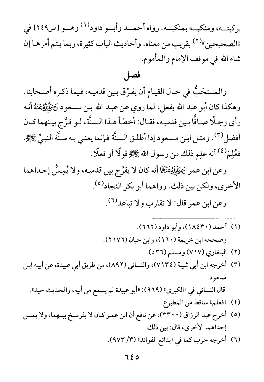 والمستحَبُّ في حال القيام أن يفرِّق بين قدميه, فيما ذكره أصحابنا. وهكذا كان أبو عبد الله يفعل, لما روي عن عبد الله بن مسعود - رضي الله عنه - أنه رأى رجلًا صافًّا بين قدميه، فقال: أخطأ هذا السنَّة, لو فرَّج بينهما كان أفضل (¬٣). ومثل ابن مسعود إذا أطلق السنَّة فإنما يعني به سنَّة النبيِّ - صلى الله عليه وسلم -. فعُلِمَ (¬٤) أنه علِم ذلك من رسول الله - صلى الله عليه وسلم - قولًا أو فعلًا.