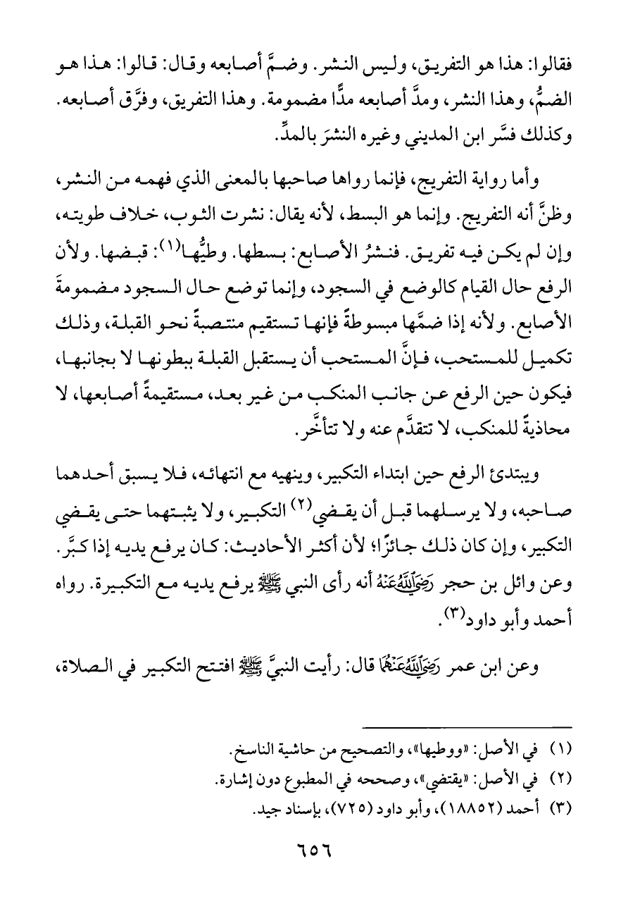 وأما رواية التفريج، فإنما رواها صاحبها بالمعنى الذي فهمه من النشر, وظنَّ أنه التفريج. وإنما هو البسط، لأنه يقال: نشرت الثوب, خلاف طويته, وإن لم يكن فيه تفريق. فنشرُ الأصابع: بسطها. وطيُّها (¬١): قبضها. ولأن الرفع حال القيام كالوضع في السجود, وإنما توضع حال السجود مضمومةَ الأصابع. ولأنه إذا ضمَّها مبسوطةً فإنها تستقيم منتصبةً نحو القبلة, وذلك تكميل للمستحب, فإنَّ المستحب أن يستقبل القبلة ببطونها لا بجانبها, فيكون حين الرفع عن جانب المنكب من غير بعد, مستقيمةً أصابعها, لا محاذيةً للمنكب, لا تتقدَّم عنه ولا تتأخَّر.