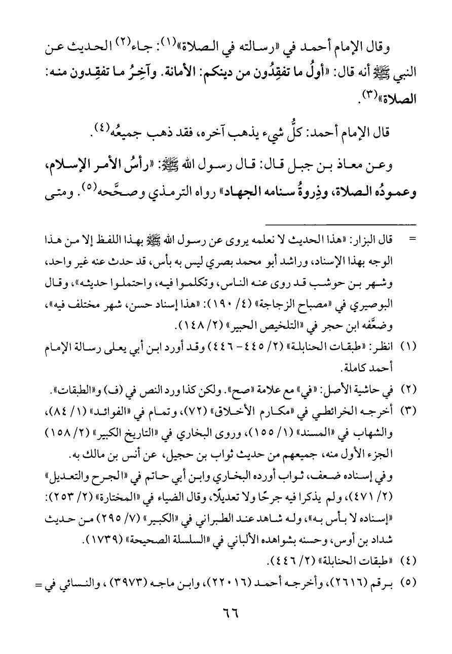 وقال الإمام أحمد في «رسالته في الصلاة» (¬١): جاء (¬٢) الحديث عن النبي - صلى الله عليه وسلم - أنه قال: «أولُ ما تفقِدُون من دينكم: الأمانة. وآخِرُ ما تفقِدون منه: الصلاة» (¬٣).