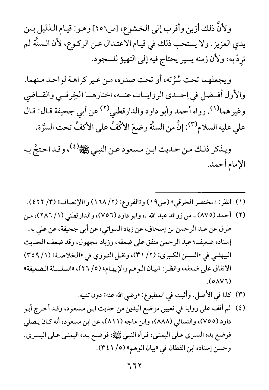 ويجعلهما تحت سُرَّته, أو تحت صدره, من غير كراهة لواحد منهما. والأول أفضل في إحدى الروايات عنه, اختارها الخِرقي والقاضي وغيرهما (¬١). رواه أحمد وأبو داود والدارقطني (¬٢) عن أبي جحيفة قال: قال علي عليه السلام (¬٣): إنَّ من السنَّة وضعَ الأكُفِّ على الأكفِّ تحت السرَّة.