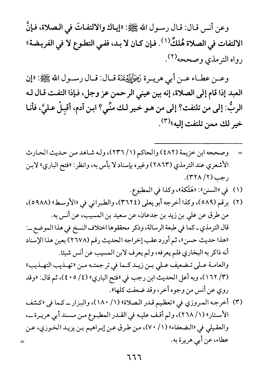 وعن أنس قال: قال رسول الله - صلى الله عليه وسلم -: «إياك والالتفاتَ في الصلاة, فإنَّ الالتفات في الصلاة هُلكٌ (¬١). فإن كان لا بد, ففي التطوع لا في الفريضة» رواه الترمذي وصححه (¬٢).