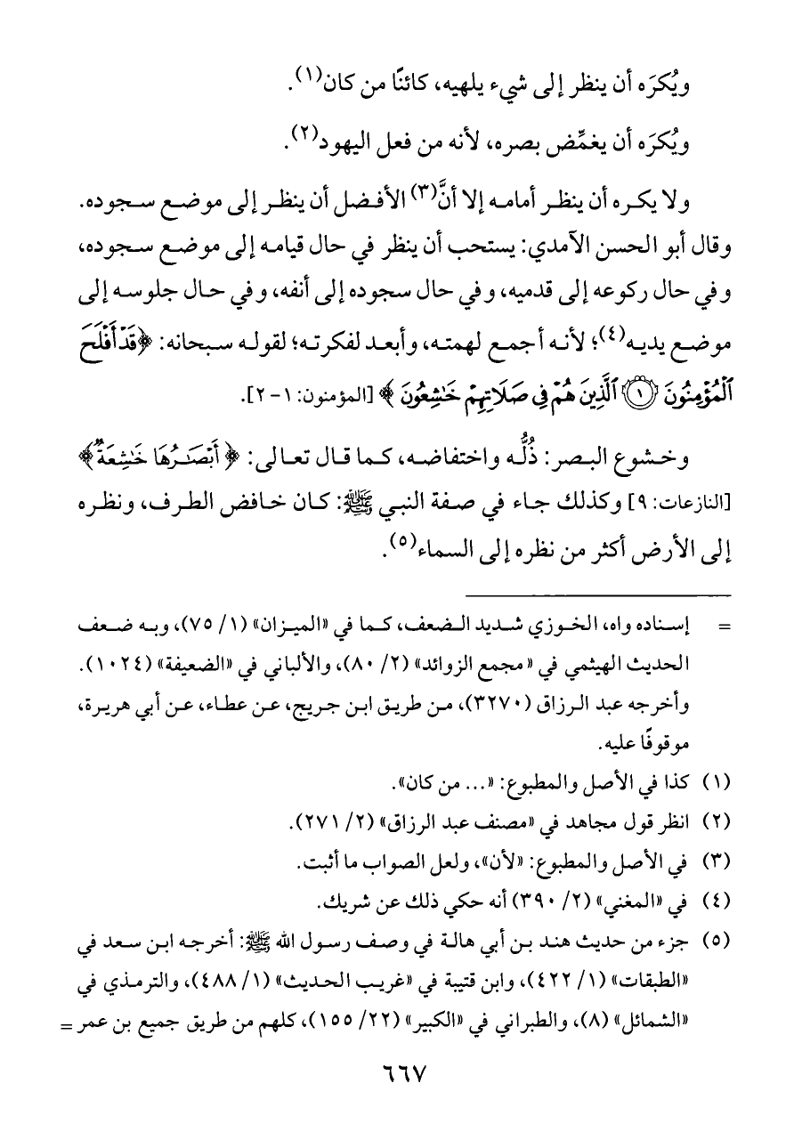 ولا يكره أن ينظر أمامه إلا أنَّ (¬٣) الأفضل أن ينظر إلى موضع سجوده. وقال أبو الحسن الآمدي: يستحب أن ينظر في حال قيامه إلى موضع سجوده, وفي حال ركوعه إلى قدميه, وفي حال سجوده إلى أنفه, وفي حال جلوسه إلى موضع يديه (¬٤)؛ لأنه أجمع لهمته, وأبعد لفكرته؛ لقوله سبحانه: {قَدْ أَفْلَحَ الْمُؤْمِنُونَ (١) الَّذِينَ هُمْ فِي صَلَاتِهِمْ خَاشِعُونَ} [المؤمنون: ١ - ٢].