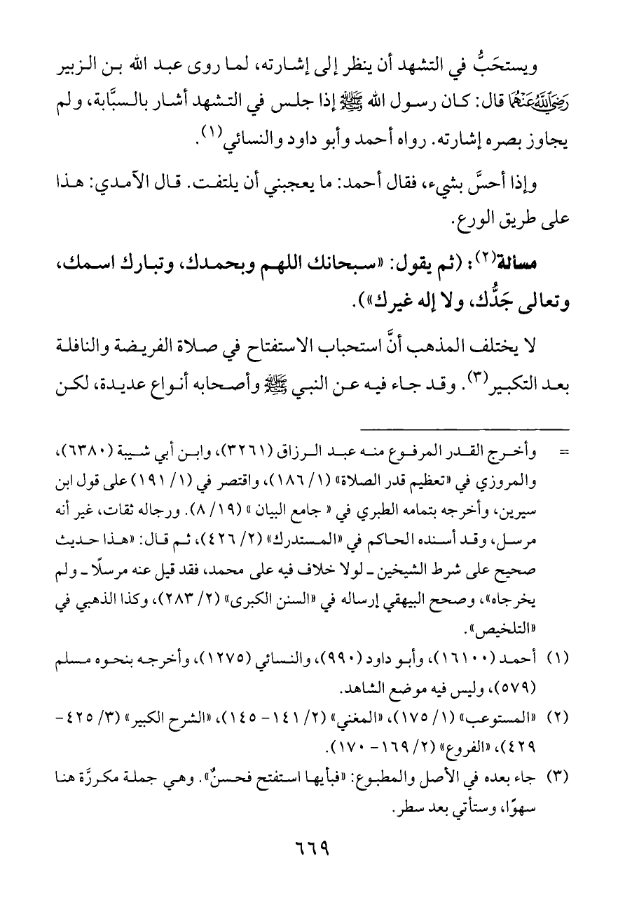 ويستحَبُّ في التشهد أن ينظر إلى إشارته، لما روى عبد الله بن الزبير - رضي الله عنهما - قال: كان رسول الله - صلى الله عليه وسلم - إذا جلس في التشهد أشار بالسبَّابة, ولم يجاوز بصره إشارته. رواه أحمد وأبو داود والنسائي (¬١).
