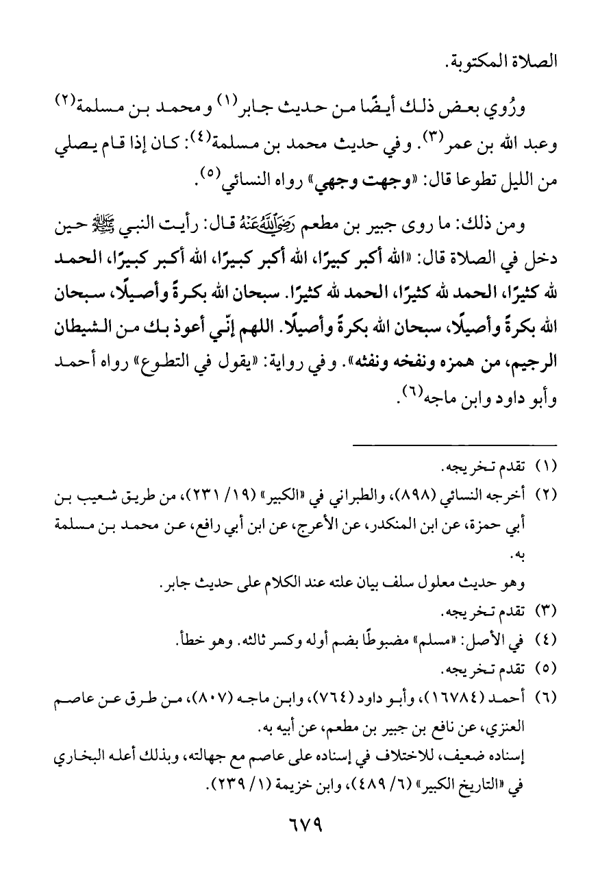 ورُوي بعض ذلك أيضًا من حديث جابر (¬١) ومحمد بن مسلمة (¬٢) وعبد الله بن عمر (¬٣). وفي حديث محمد بن مسلمة (¬٤): كان إذا قام يصلي من الليل تطوعا قال: «وجهت وجهي» رواه النسائي (¬٥).