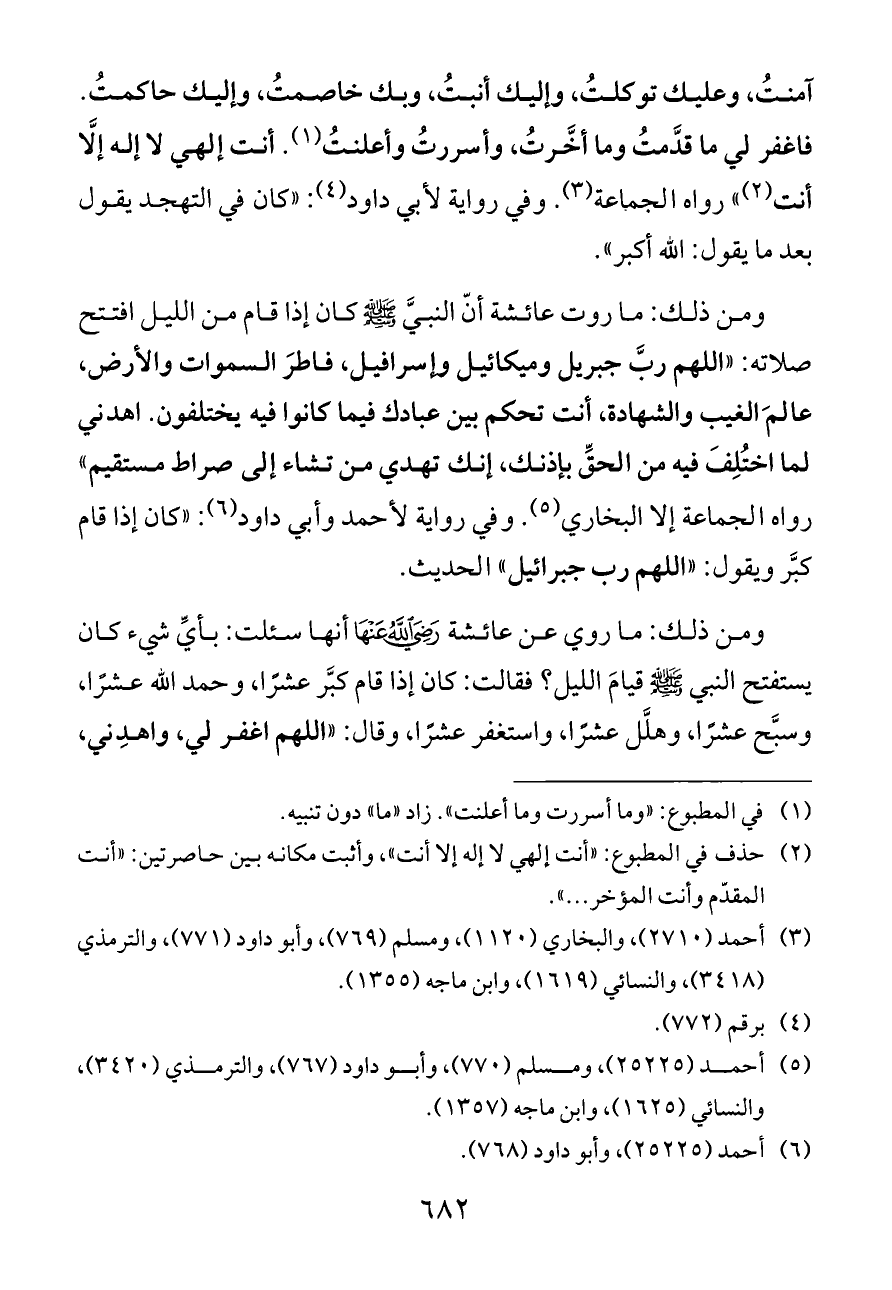 آمنتُ, وعليك توكلتُ, وإليك أنبتُ, وبك خاصمتُ, وإليك حاكمتُ. فاغفر لي ما قدَّمتُ وما أخَّرتُ, وأسررتُ وأعلنتُ (¬١). أنت إلهي لا إله إلَّا أنت (¬٢)» رواه الجماعة (¬٣). وفي رواية لأبي داود (¬٤): «كان في التهجد يقول بعد ما يقول: الله أكبر».