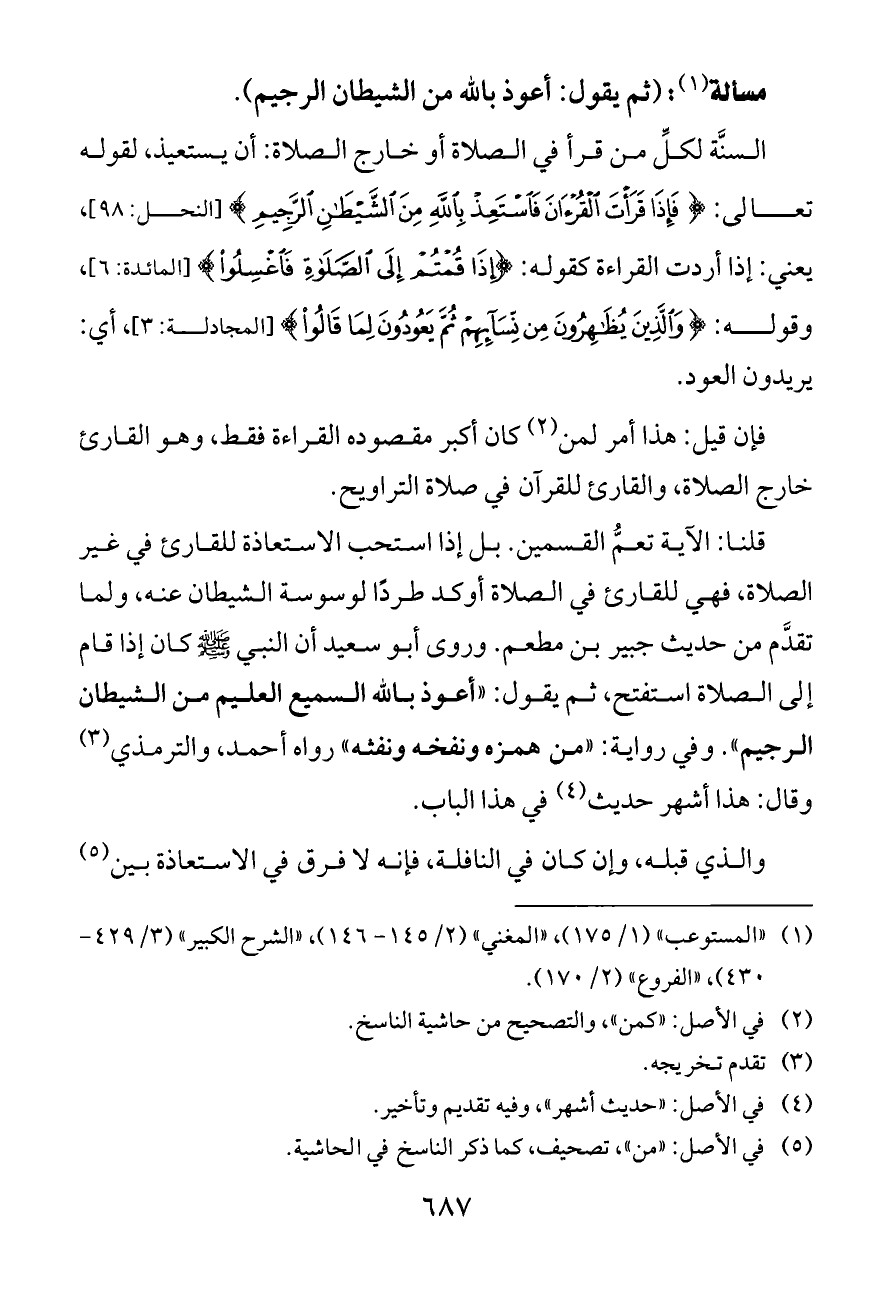 مسألة (¬١): (ثم يقول: أعوذ بالله من الشيطان الرجيم).