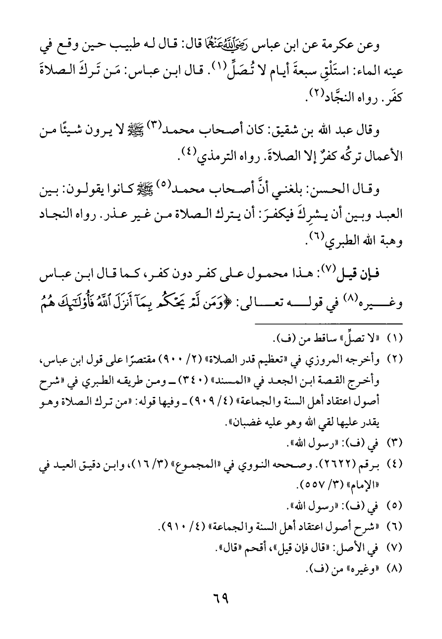 وعن عكرمة عن ابن عباس - رضي الله عنهما - قال: قال له طبيب حين وقع في عينه الماء: استَلْقِ سبعةَ أيام لا تُصَلِّ (¬١). قال ابن عباس: مَن تَركَ الصلاةَ كفَر. رواه النجَّاد (¬٢).