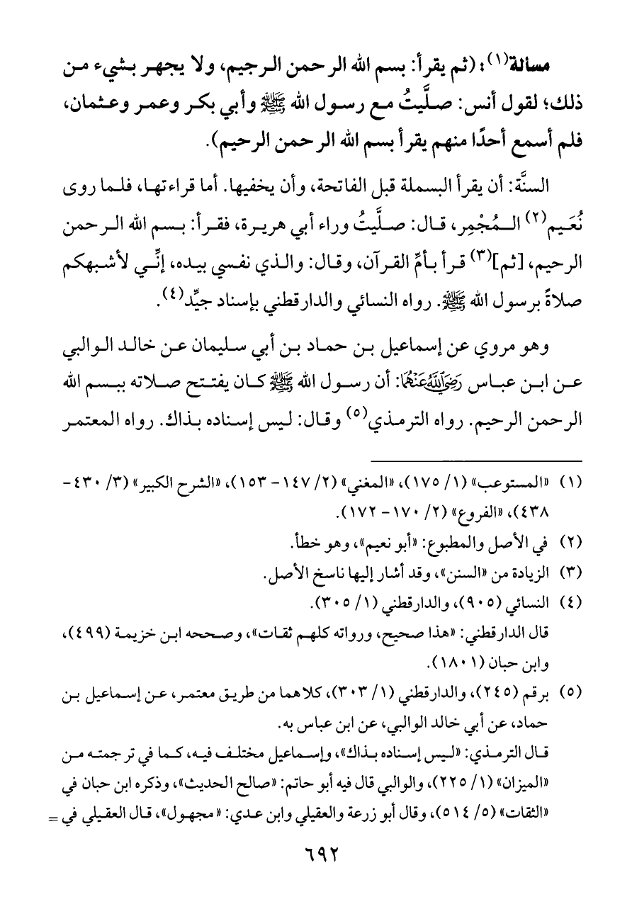 السنَّة: أن يقرأ البسملة قبل الفاتحة, وأن يخفيها. أما قراءتها، فلما روى نُعَيم (¬٢) المُجْمِر, قال: صلَّيتُ وراء أبي هريرة، فقرأ: بسم الله الرحمن الرحيم, [ثم] (¬٣) قرأ بأمِّ القرآن, وقال: والذي نفسي بيده، إنِّي لأشبهكم صلاةً برسول الله - صلى الله عليه وسلم -. رواه النسائي والدارقطني بإسناد جيِّد (¬٤).