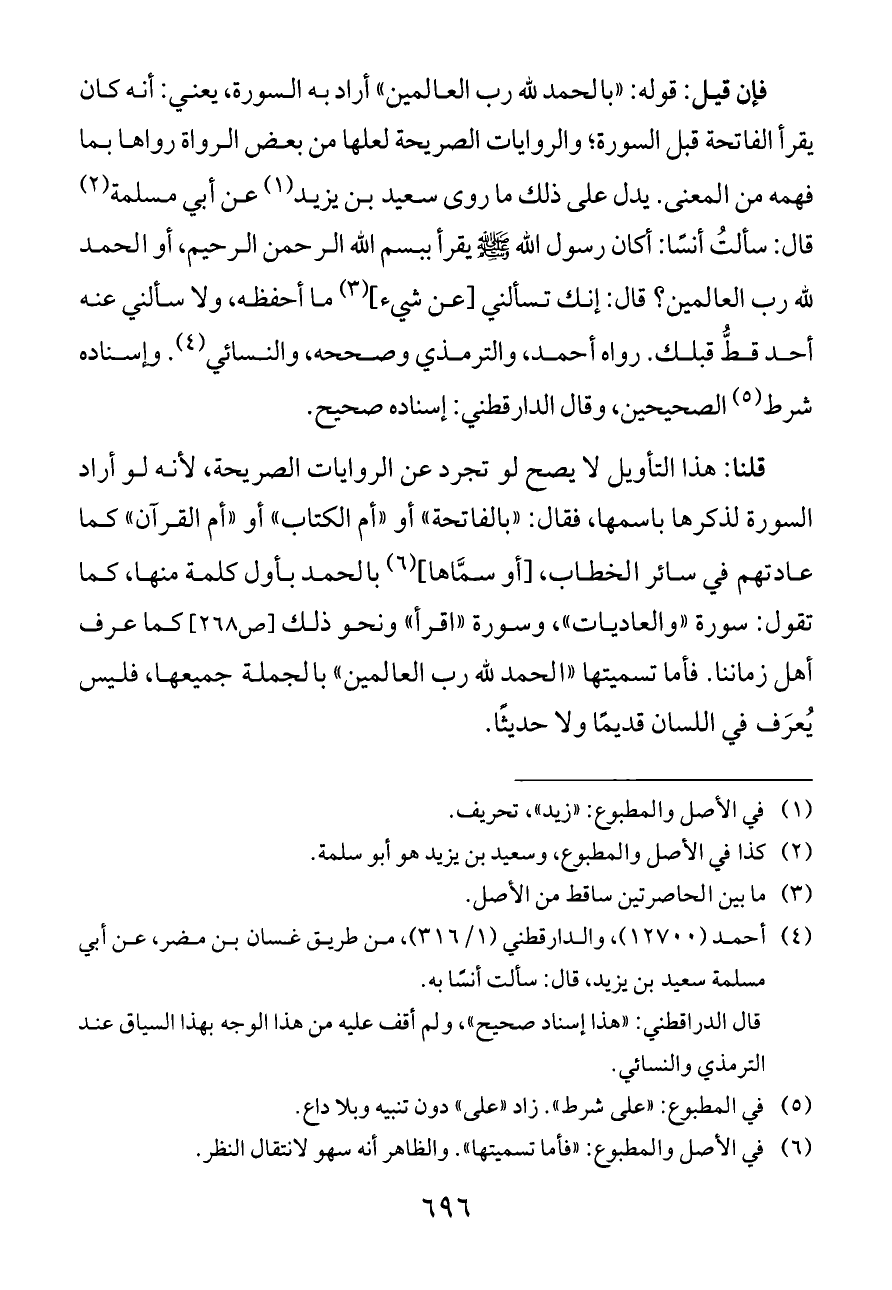 قلنا: هذا التأويل لا يصح لو تجرد عن الروايات الصريحة، لأنه لو أراد السورة لذكرها باسمها, فقال: «بالفاتحة» أو «أم الكتاب» أو «أم القرآن» كما عادتهم في سائر الخطاب, [أو سمَّاها] (¬٦) بالحمد بأول كلمة منها, كما تقول: سورة «والعاديات»، وسورة «اقرأ» ونحو ذلك [ص ٢٦٨] كما عرف أهل زماننا. فأما تسميتها «الحمد لله رب العالمين» بالجملة جميعها, فليس يُعرَف في اللسان قديمًا ولا حديثًا.