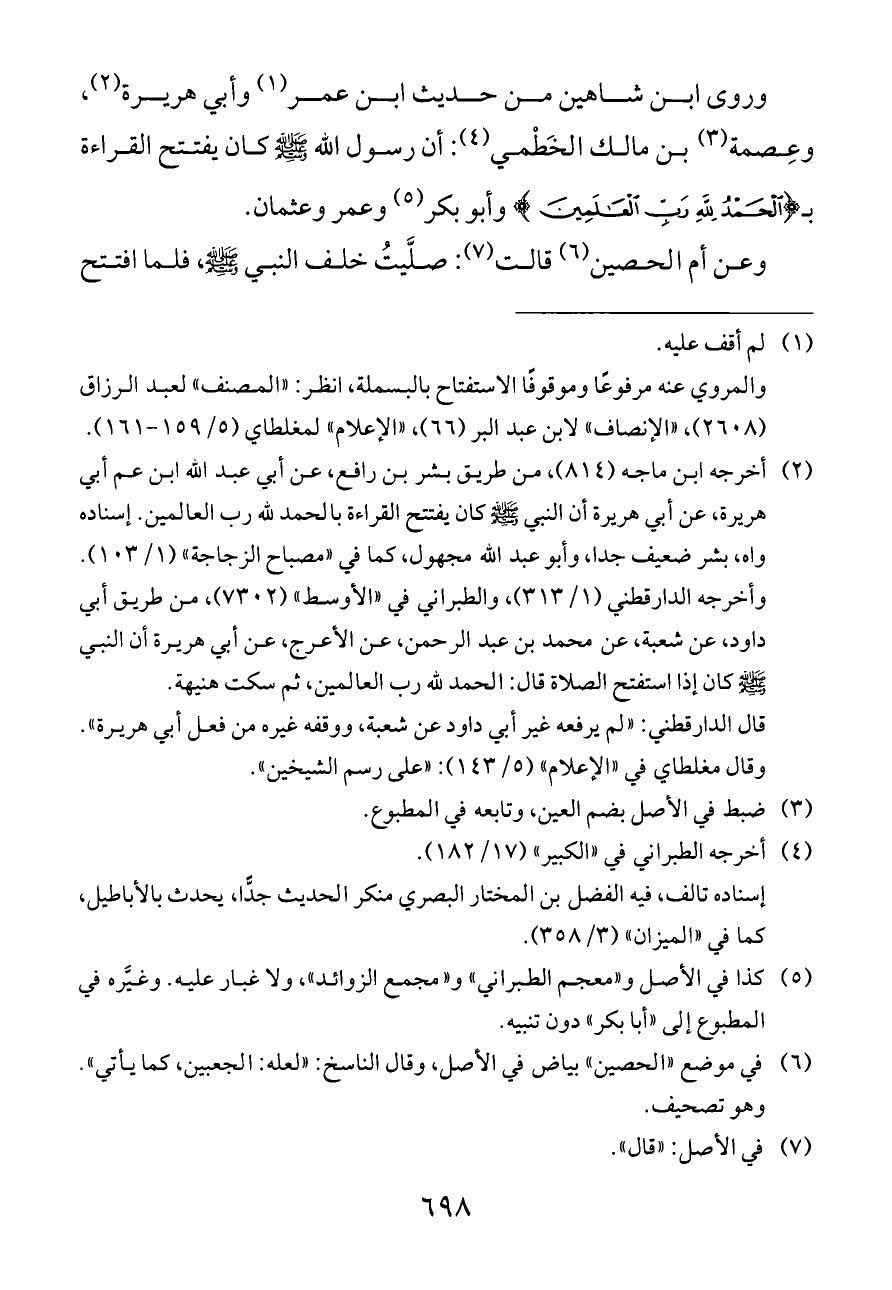 وأبي هريرة (¬٢) , وعِصمة (¬٣) بن مالك الخَطْمي (¬٤): أن رسول الله - صلى الله عليه وسلم - كان يفتتح القراءة بـ {الْحَمْدُ لِلَّهِ رَبِّ الْعَالَمِينَ} وأبو بكر (¬٥) وعمر وعثمان.