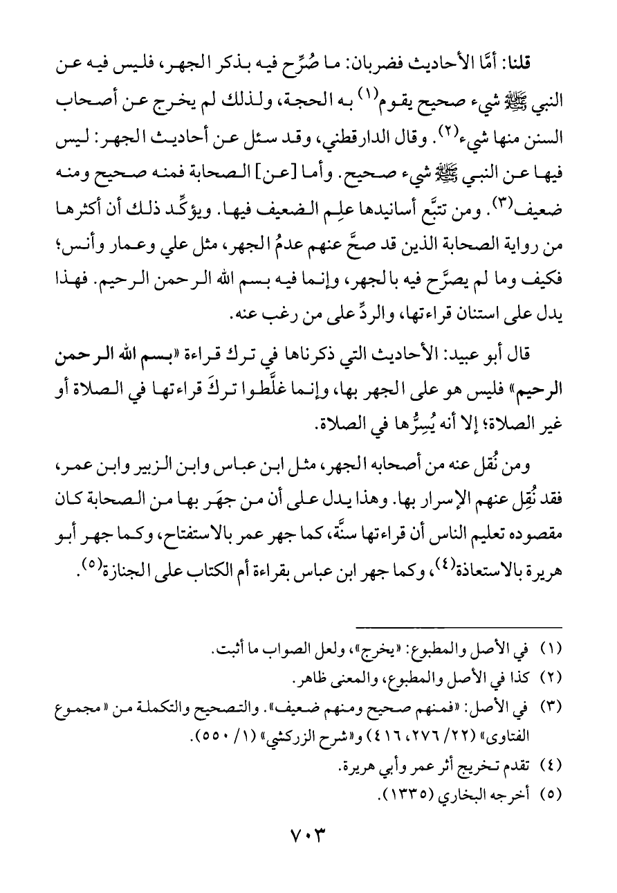 قال أبو عبيد: الأحاديث التي ذكرناها في ترك قراءة «بسم الله الرحمن الرحيم» فليس هو على الجهر بها, وإنما غلَّطوا تركَ قراءتها في الصلاة أو غير الصلاة؛ إلا أنه يُسِرُّها في الصلاة.