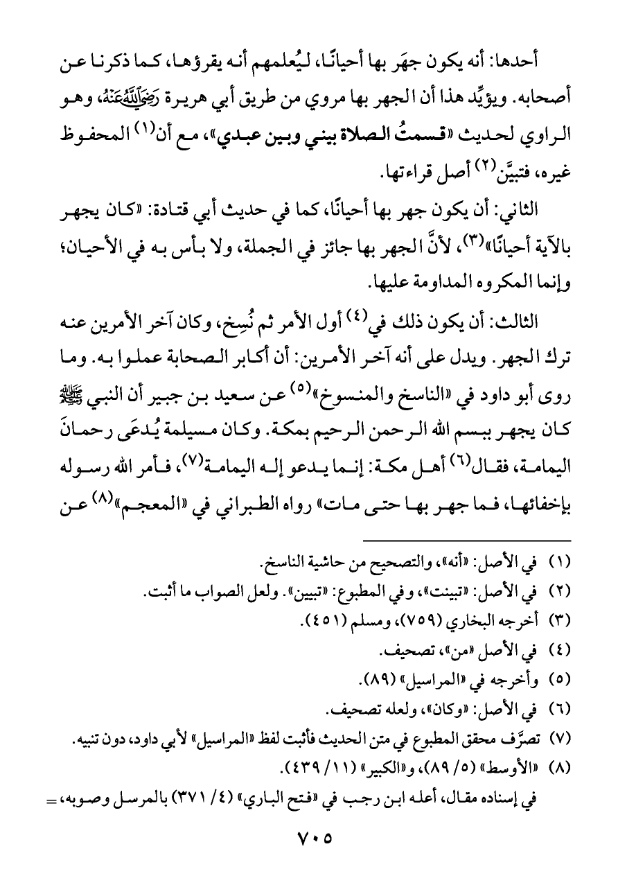 الثاني: أن يكون جهر بها أحيانًا, كما في حديث أبي قتادة: «كان يجهر بالآية أحيانًا» (¬٣)، لأنَّ الجهر بها جائز في الجملة, ولا بأس به في الأحيان؛ وإنما المكروه المداومة عليها.