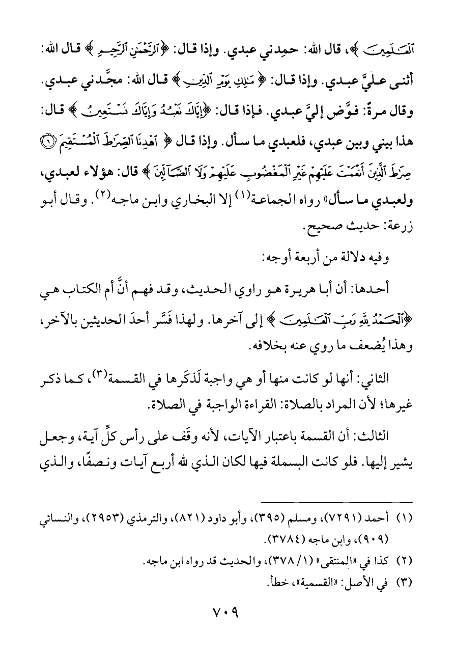 الْعَالَمِينَ}، قال الله: حمِدني عبدي. وإذا قال: {الرَّحْمَنِ الرَّحِيمِ} قال الله: أثنى عليَّ عبدي. وإذا قال: {مَالِكِ يَوْمِ الدِّينِ} قال الله: مجَّدني عبدي. وقال مرةً: فوَّض إليَّ عبدي. فإذا قال: {إِيَّاكَ نَعْبُدُ وَإِيَّاكَ نَسْتَعِينُ} قال: هذا بيني وبين عبدي, فلعبدي ما سأل. وإذا قال {اهْدِنَا الصِّرَاطَ الْمُسْتَقِيمَ (٦) صِرَاطَ الَّذِينَ أَنْعَمْتَ عَلَيْهِمْ غَيْرِ الْمَغْضُوبِ عَلَيْهِمْ وَلَا الضَّالِّينَ} قال: هؤلاء لعبدي, ولعبدي ما سأل» رواه الجماعة (¬١) إلا البخاري وابن ماجه (¬٢). وقال أبو زرعة: حديث صحيح.