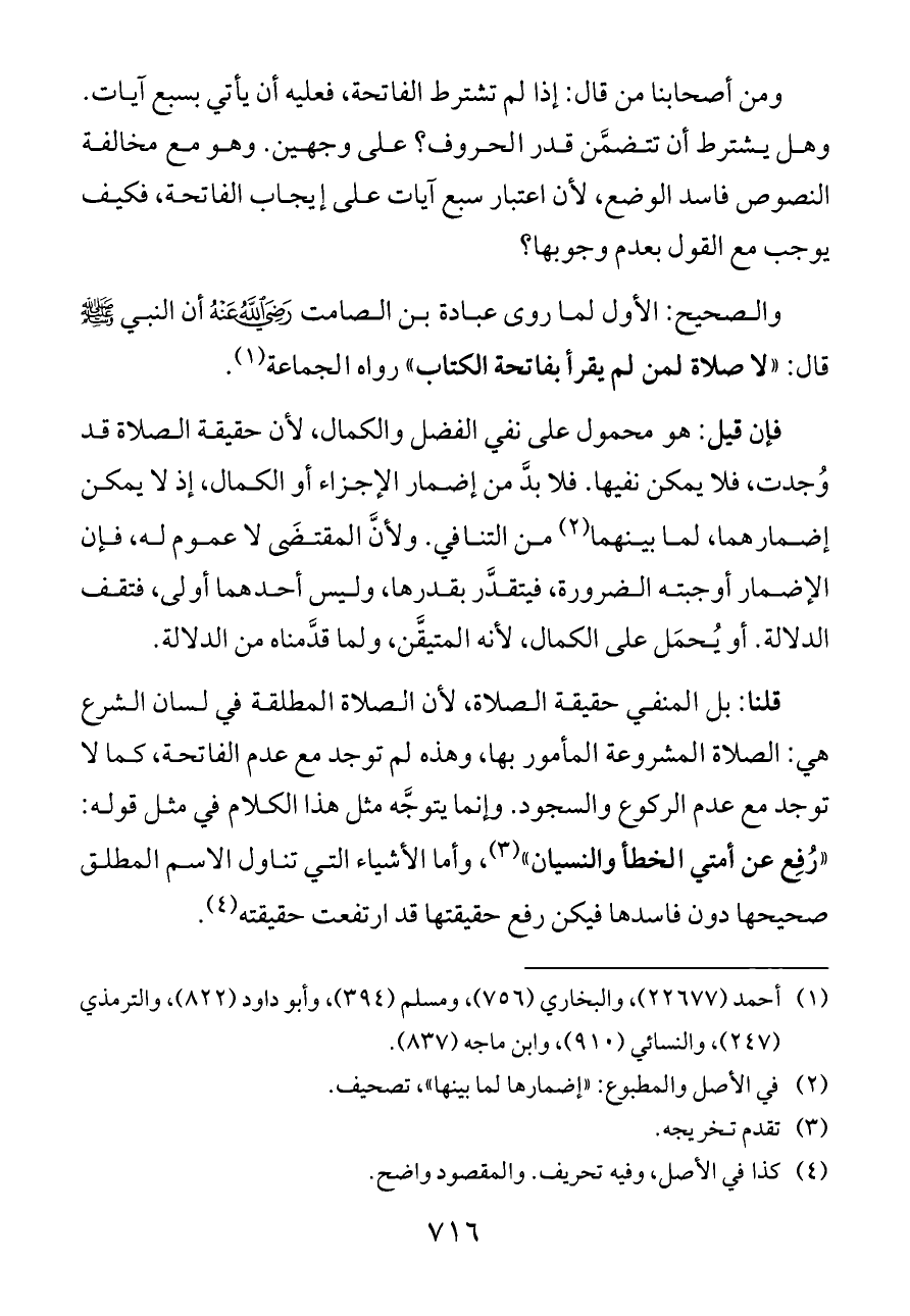 قلنا: بل المنفي حقيقة الصلاة، لأن الصلاة المطلقة في لسان الشرع هي: الصلاة المشروعة المأمور بها, وهذه لم توجد مع عدم الفاتحة, كما لا توجد مع عدم الركوع والسجود. وإنما يتوجَّه مثل هذا الكلام في مثل قوله: «رُفِع عن أمتي الخطأ والنسيان» (¬٣)، وأما الأشياء التي تناول الاسم المطلق صحيحها دون فاسدها فيكن رفع حقيقتها قد ارتفعت حقيقته (¬٤).