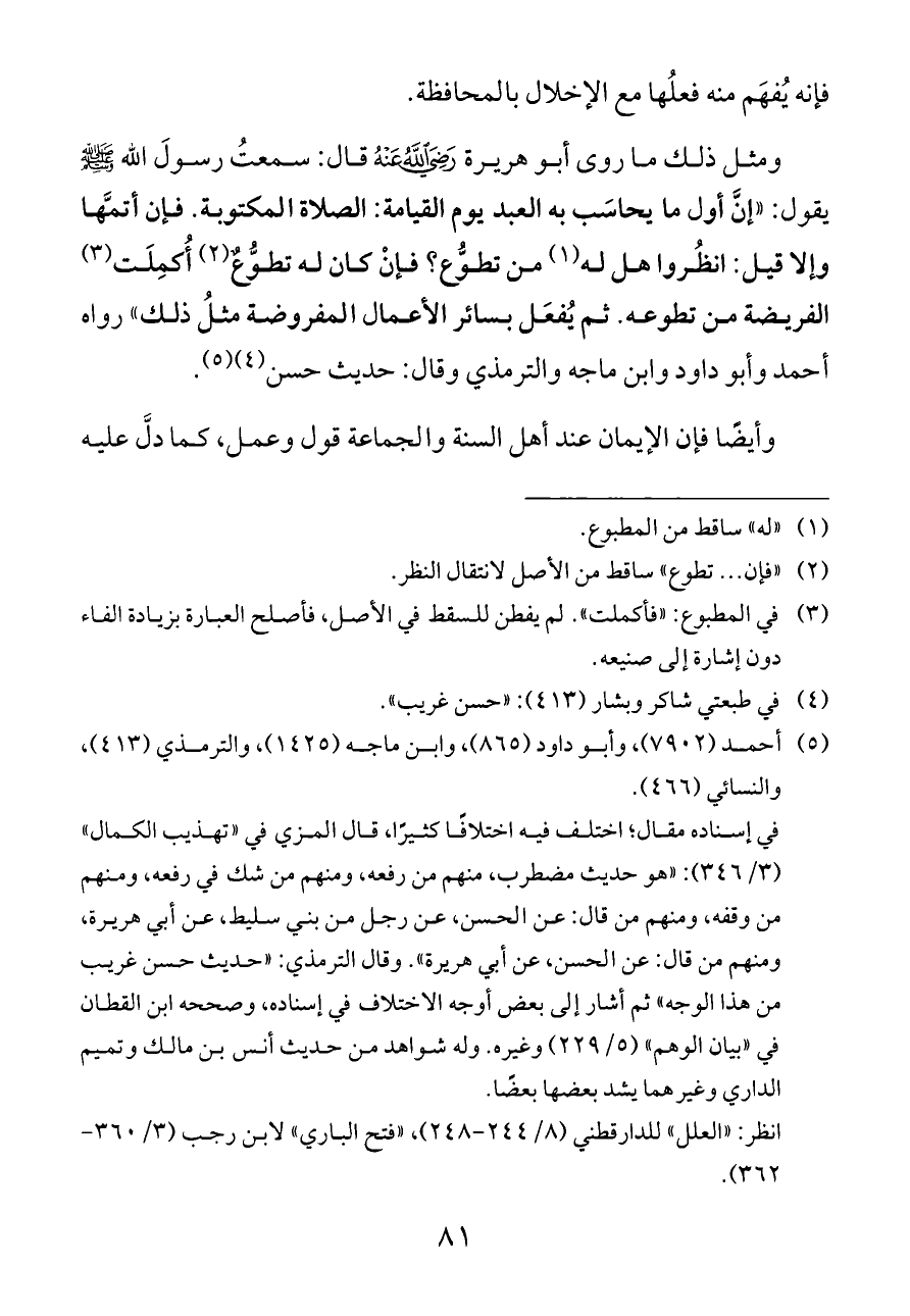 ومثل ذلك ما روى أبو هريرة - رضي الله عنه - قال: سمعتُ رسولَ الله - صلى الله عليه وسلم - يقول: «إنَّ أول ما يحاسَب به العبد يوم القيامة: الصلاة المكتوبة. فإن أتمَّها وإلا قيل: انظُروا هل له (¬١) من تطوُّع؟ فإنْ كان له تطوُّعٌ (¬٢) أُكمِلَت (¬٣) الفريضة من تطوعه. ثم يُفعَل بسائر الأعمال المفروضة مثلُ ذلك» رواه أحمد وأبو داود وابن ماجه والترمذي وقال: حديث حسن (¬٤) (¬٥).