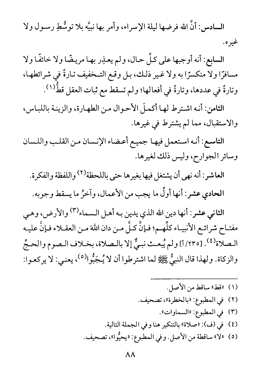 السابع: أنه أوجبها على كلِّ حال، ولم يعذِر بها مريضًا ولا خائفًا ولا مسافرًا ولا منكسرًا به ولا غير ذلك، بل وقع التخفيف تارةً في شرائطها، وتارةً في عددها، وتارةً في أفعالها؛ ولم تسقط مع ثبات العقل قطُّ (¬١).