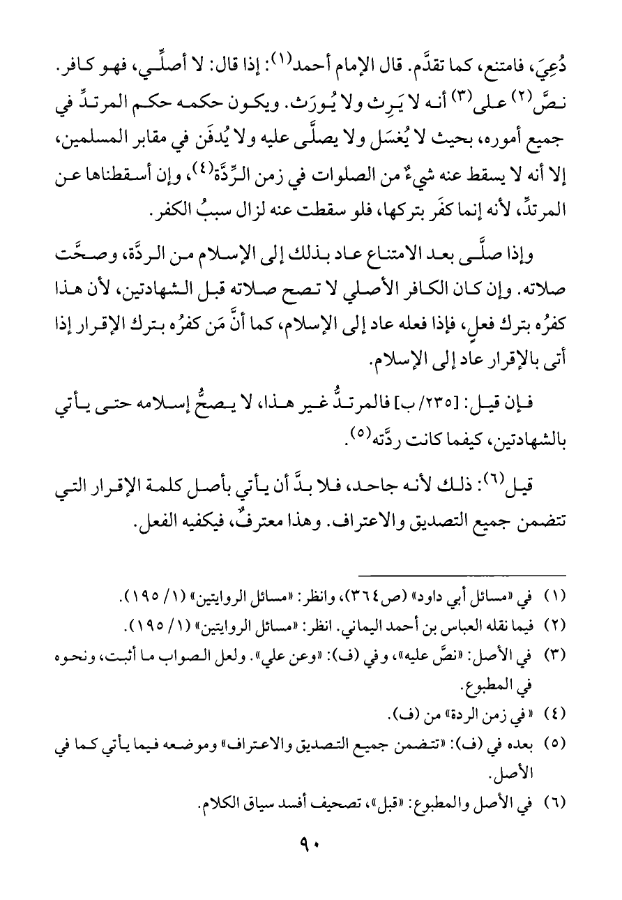 دُعِيَ، فامتنع، كما تقدَّم. قال الإمام أحمد (¬١): إذا قال: لا أصلِّي، فهو كافر. نصَّ (¬٢) على (¬٣) أنه لا يَرِث ولا يُورَث. ويكون حكمه حكم المرتدِّ في جميع أموره، بحيث لا يُغسَل ولا يصلَّى عليه ولا يُدفَن في مقابر المسلمين، إلا أنه لا يسقط عنه شيءٌ من الصلوات في زمن الرِّدَّة (¬٤)، وإن أسقطناها عن المرتدِّ، لأنه إنما كفَر بتركها، فلو سقطت عنه لزال سببُ الكفر.