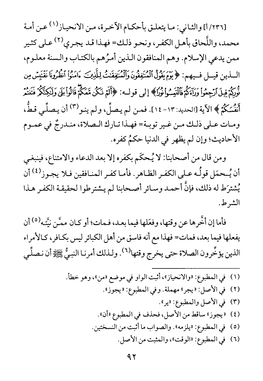 [٢٣٦/أ] والثاني: ما يتعلق بأحكام الآخرة، من الانحياز (¬١) عن أمة محمد، واللَّحاق بأهل الكفر، ونحو ذلك= فهذا قد يجري (¬٢) على كثير ممن يدعي الإسلام. وهم المنافقون الذين أمرُهم بالكتاب والسنة معلوم، الذين قيل فيهم: {يَوْمَ يَقُولُ الْمُنَافِقُونَ وَالْمُنَافِقَاتُ لِلَّذِينَ آمَنُوا انْظُرُونَا نَقْتَبِسْ مِنْ نُورِكُمْ قِيلَ ارْجِعُوا وَرَاءَكُمْ فَالْتَمِسُوا نُورًا} إلى قوله: {أَلَمْ نَكُنْ مَعَكُمْ قَالُوا بَلَى وَلَكِنَّكُمْ فَتَنْتُمْ أَنْفُسَكُمْ} الآية [الحديد: ١٣ - ١٤]. فمن لم يصلِّ، ولم ينو (¬٣) أن يصلِّي قطُّ، ومات على ذلك من غير توبة= فهذا تارك الصلاة، مندرجٌ في عموم الأحاديث؛ وإن لم يظهر في الدنيا حكمُ كفره.