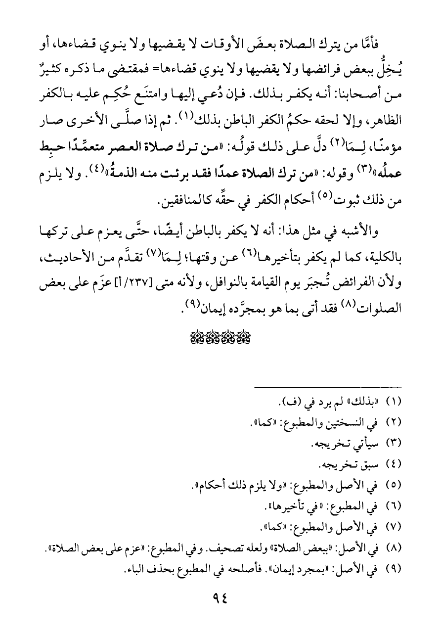 والأشبه في مثل هذا: أنه لا يكفر بالباطن أيضًا، حتَّى يعزم على تركها بالكلية، كما لم يكفر بتأخيرها (¬٦) عن وقتها؛ لِمَا (¬٧) تقدَّم من الأحاديث، ولأن الفرائض تُجبَر يوم القيامة بالنوافل، ولأنه متى [٢٣٧/أ] عزَم على بعض الصلوات (¬٨) فقد أتى بما هو بمجرَّده إيمان (¬٩).