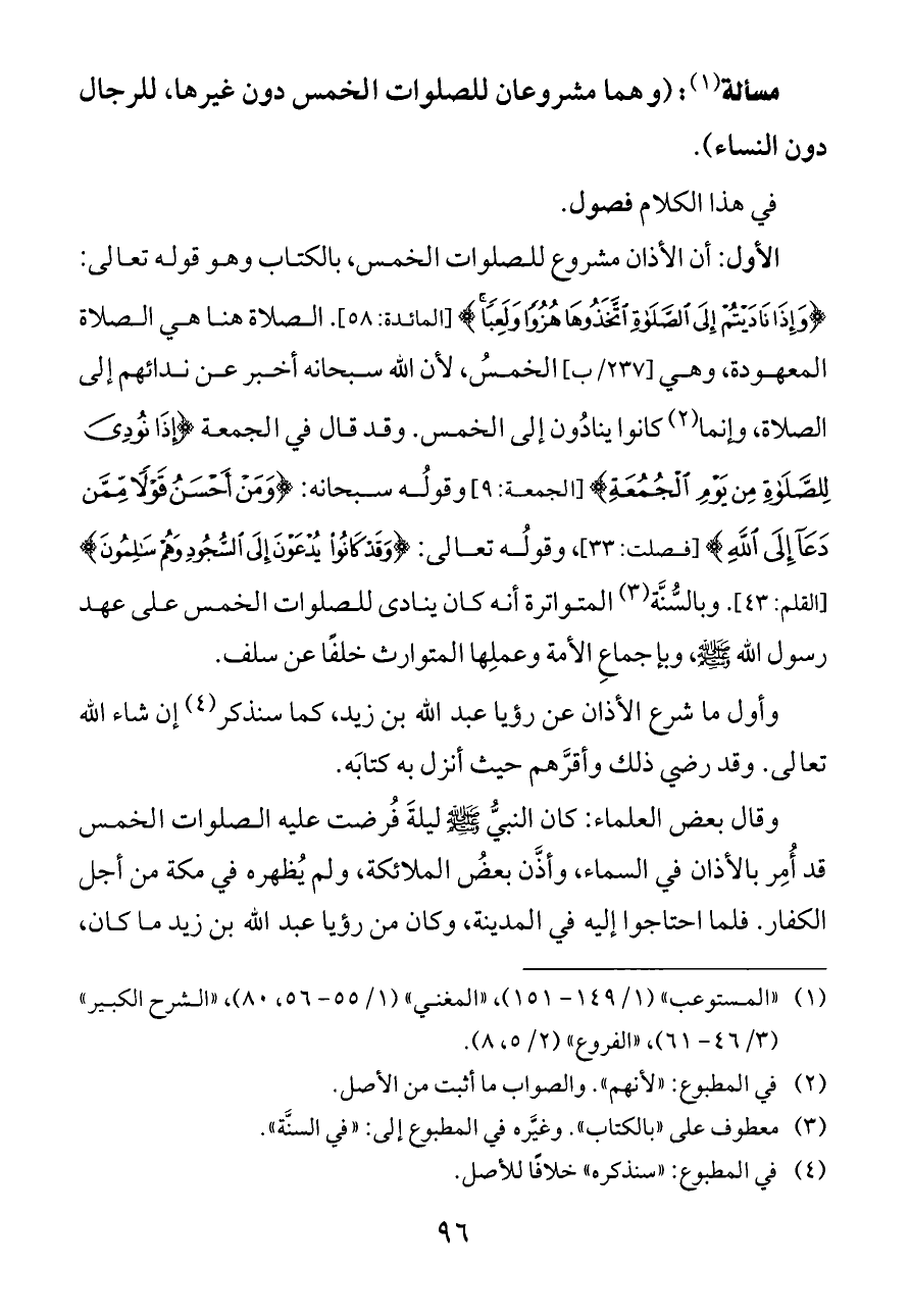 الأول: أن الأذان مشروع للصلوات الخمس، بالكتاب وهو قوله تعالى: {وَإِذَا نَادَيْتُمْ إِلَى الصَّلَاةِ اتَّخَذُوهَا هُزُوًا وَلَعِبًا} [المائدة: ٥٨]. الصلاة هنا هي الصلاة المعهودة، وهي [٢٣٧/ب] الخمسُ، لأن الله سبحانه أخبر عن ندائهم إلى الصلاة، وإنما (¬٢) كانوا ينادُون إلى الخمس. وقد قال في الجمعة {إِذَا نُودِيَ لِلصَّلَاةِ مِنْ يَوْمِ الْجُمُعَةِ} [الجمعة: ٩] وقولُه سبحانه: {وَمَنْ أَحْسَنُ قَوْلًا مِمَّنْ دَعَا إِلَى اللَّهِ} [فصلت: ٣٣]، وقولُه تعالى: {وَقَدْ كَانُوا يُدْعَوْنَ إِلَى السُّجُودِ وَهُمْ سَالِمُونَ} [القلم: ٤٣]. وبالسُّنَّة (¬٣) المتواترة أنه كان ينادى للصلوات الخمس على عهد رسول الله - صلى الله عليه وسلم -، وبإجماعِ الأمة وعملِها المتوارث خلفًا عن سلف.