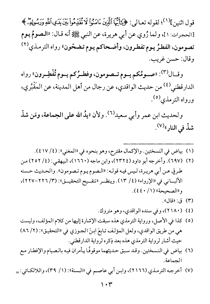 وقال (¬٣): «صومُكم يوم تصومون، وفطرُكم يوم تُفْطِرون» رواه الدارقطني (¬٤) من حديث الواقدي، عن رجال من أهل المدينة، عن المَقْبُري، ورواه الترمذي (¬٥).