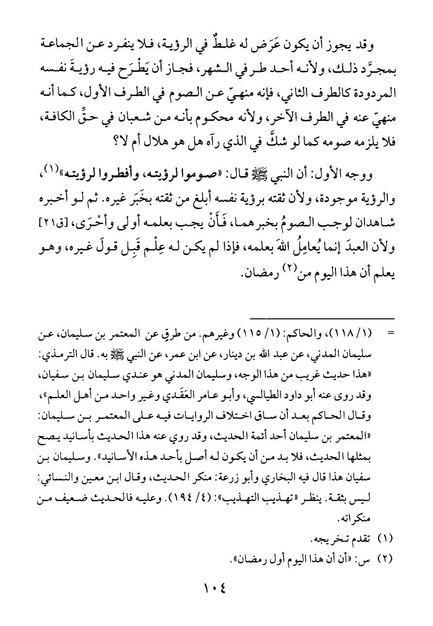 وقد يجوز أن يكون عَرَض له غلطٌ في الرؤية، فلا ينفرد عن الجماعة بمجرَّد ذلك، ولأنه أحد طرفي الشهر، فجاز أن يَطْرَح فيه رؤيةَ نفسه المردودة كالطرف الثاني، فإنه منهيّ عن الصوم في الطرف الأول، كما أنه منهيّ عنه في الطرف الآخر، ولأنه محكوم بأنه من شعبان في حقِّ الكافة، فلا يلزمه صومه كما لو شكَّ في الذي رآه هل هو هلال أم لا؟