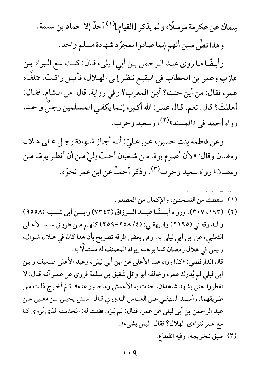 وأيضًا ما روى عبد الرحمن بن أبي ليلى، قال: كنت مع البراء بن عازب وعمر بن الخطاب في البقيع ننظر إلى الهلال، فأقبل راكبٌ، فتلقَّاه عمر، فقال: من أين جئت؟ أمِن المغرب؟ وفي رواية: قال: من الشام. فقال: أهللتَ؟ قال: نعم. قال عمر: الله أكبر، إنما يكفي المسلمين رجلٌ واحد. رواه أحمد في «المسند» (¬٢)، وسعيد وحرب.