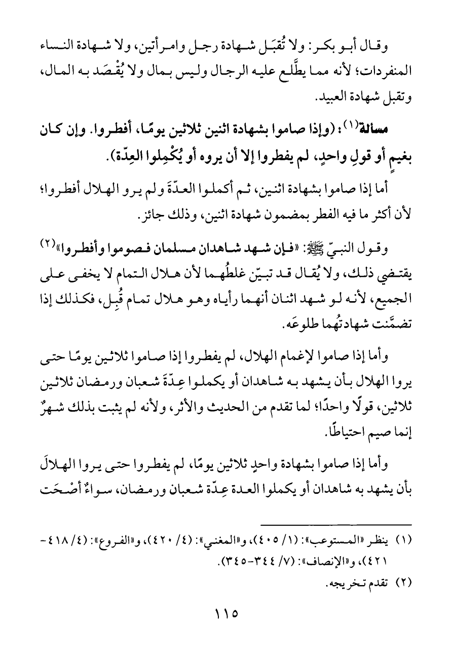 وقول النبيّ - صلى الله عليه وسلم -: «فإن شهد شاهدان مسلمان فصوموا وأفطروا» (¬٢) يقتضي ذلك، ولا يُقال قد تبيّن غلطُهما لأن هلال التمام لا يخفى على الجميع، لأنه لو شهد اثنان أنهما رأياه وهو هلال تمام قُبِل، فكذلك إذا تضمَّنت شهادتُهما طلوعَه.