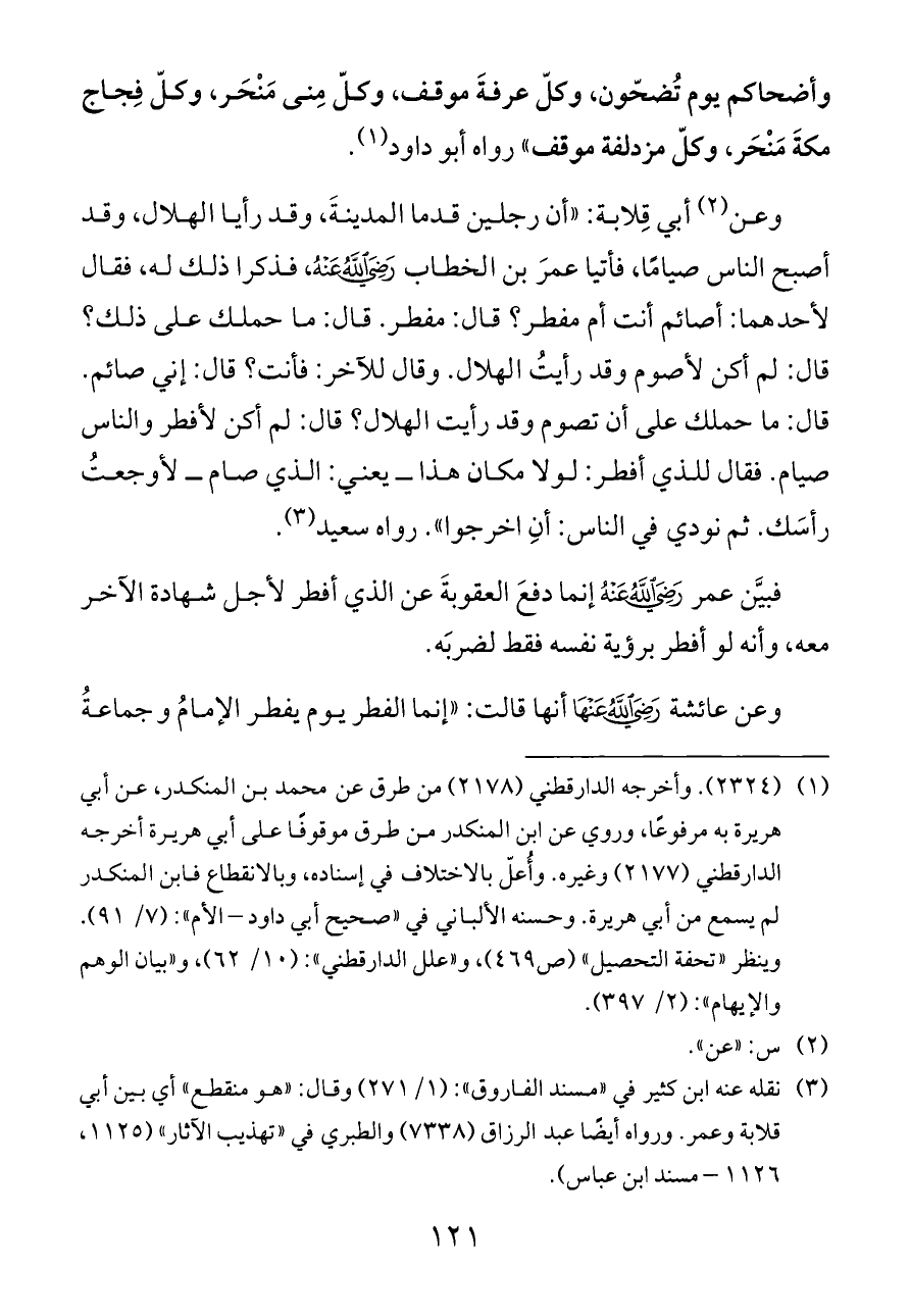 وعن (¬٢) أبي قِلابة: «أن رجلين قدما المدينةَ، وقد رأيا الهلال، وقد أصبح الناس صيامًا، فأتيا عمرَ بن الخطاب - رضي الله عنه -، فذكرا ذلك له، فقال لأحدهما: أصائم أنت أم مفطر؟ قال: مفطر. قال: ما حملك على ذلك؟ قال: لم أكن لأصوم وقد رأيتُ الهلال. وقال للآخر: فأنت؟ قال: إني صائم. قال: ما حملك على أن تصوم وقد رأيت الهلال؟ قال: لم أكن لأفطر والناس صيام. فقال للذي أفطر: لولا مكان هذا ــ يعني: الذي صام ــ لأوجعتُ رأسَك. ثم نودي في الناس: أنِ اخرجوا». رواه سعيد (¬٣).