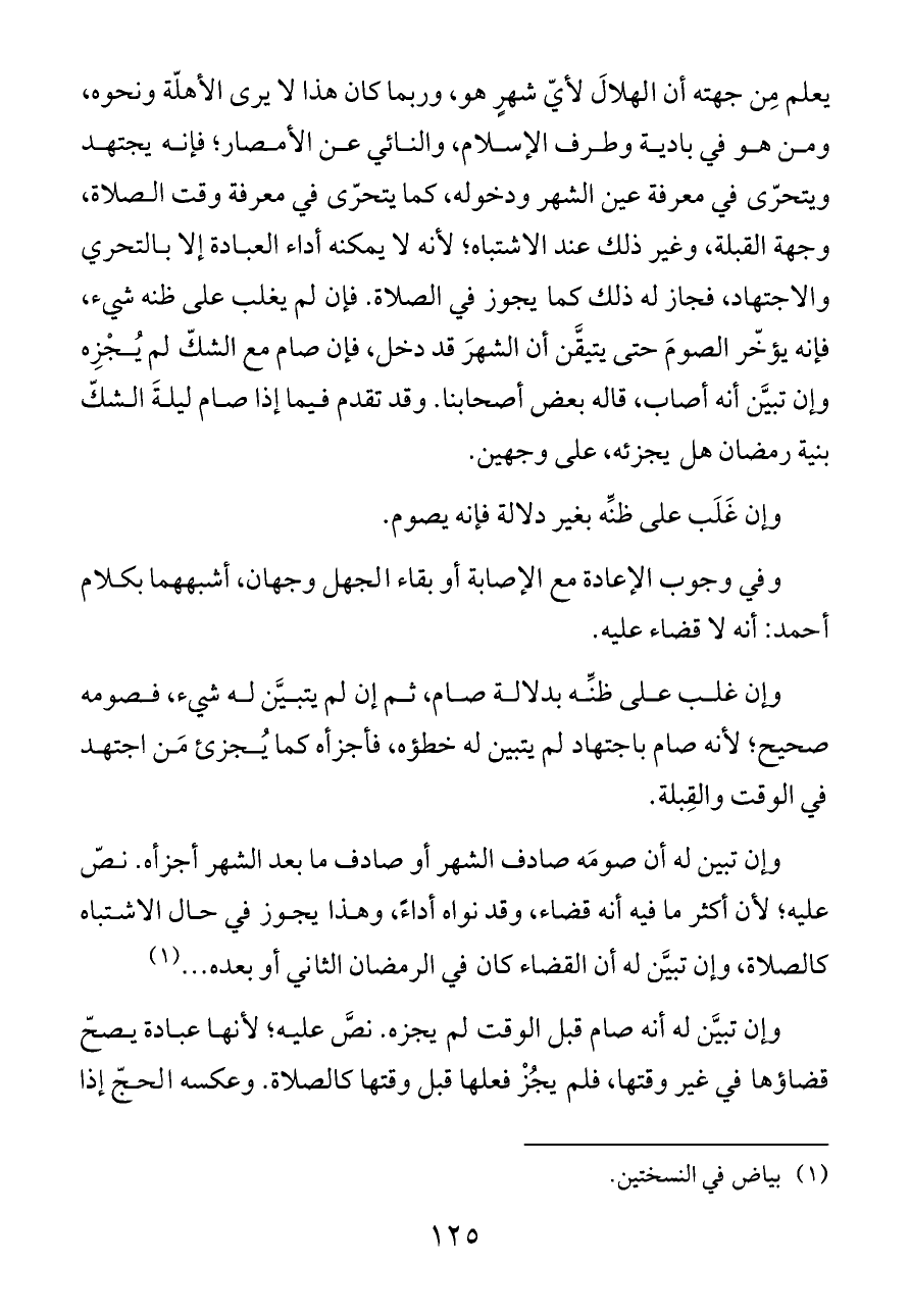 يعلم مِن جهته أن الهلالَ لأيّ شهرٍ هو، وربما كان هذا لا يرى الأهلّة ونحوه، ومن هو في بادية وطرف الإسلام، والنائي عن الأمصار؛ فإنه يجتهد ويتحرّى في معرفة عين الشهر ودخوله، كما يتحرّى في معرفة وقت الصلاة، وجهة القبلة، وغير ذلك عند الاشتباه؛ لأنه لا يمكنه أداء العبادة إلا بالتحري والاجتهاد، فجاز له ذلك كما يجوز في الصلاة. فإن لم يغلب على ظنه شيء، فإنه يؤخّر الصومَ حتى يتيقَّن أن الشهرَ قد دخل، فإن صام مع الشكّ لم يُجْزِه وإن تبيَّن أنه أصاب، قاله بعض أصحابنا. وقد تقدم فيما إذا صام ليلةَ الشكّ بنية رمضان هل يجزئه، على وجهين.