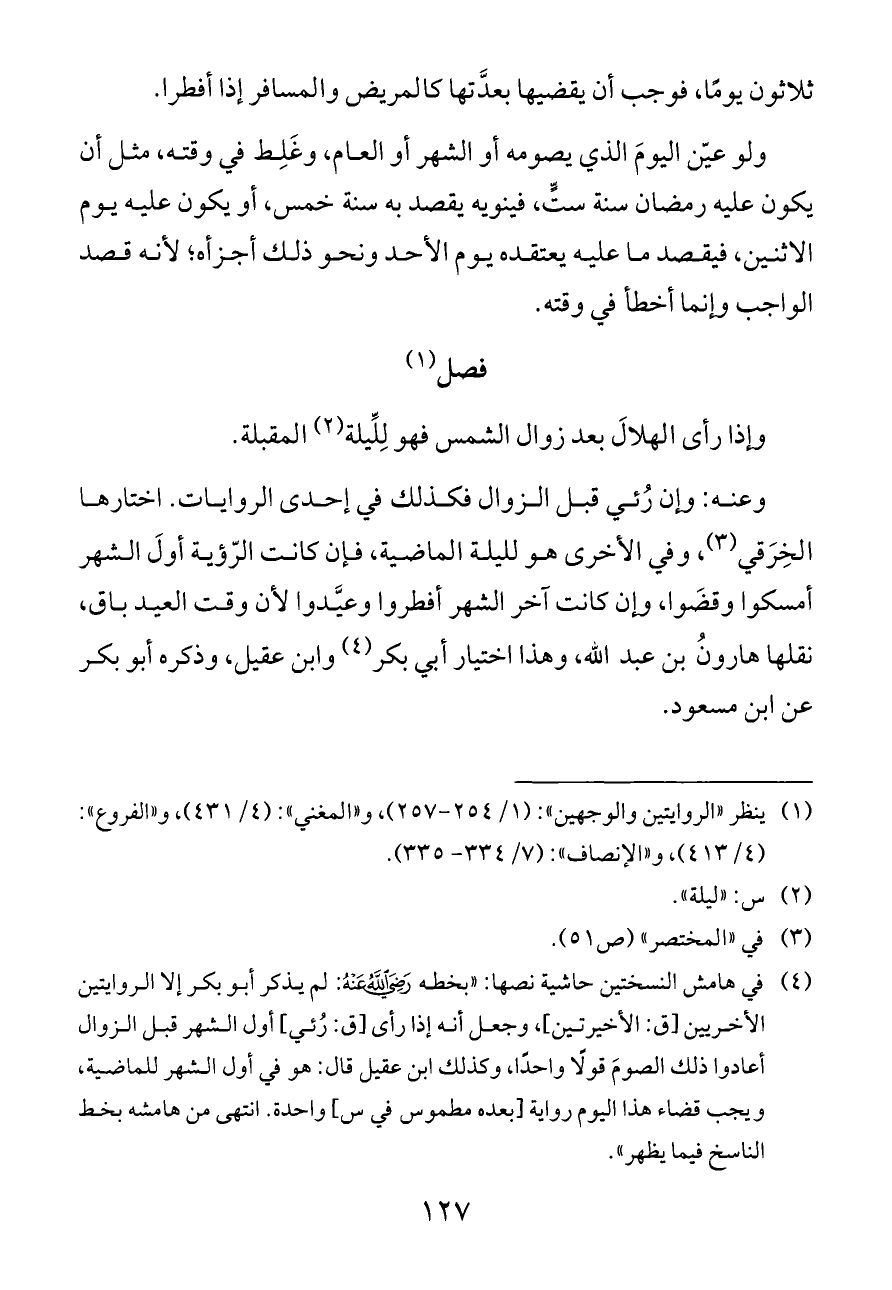 (¬٤) في هامش النسختين حاشية نصها: «بخطه - رضي الله عنه -: لم يذكر أبو بكر إلا الروايتين الأخريين [ق: الأخيرتين]، وجعل أنه إذا رأى [ق: رُئي] أول الشهر قبل الزوال أعادوا ذلك الصومَ قولًا واحدًا، وكذلك ابن عقيل قال: هو في أول الشهر للماضية، ويجب قضاء هذا اليوم رواية [بعده مطموس في س] واحدة. انتهى من هامشه بخط الناسخ فيما يظهر».