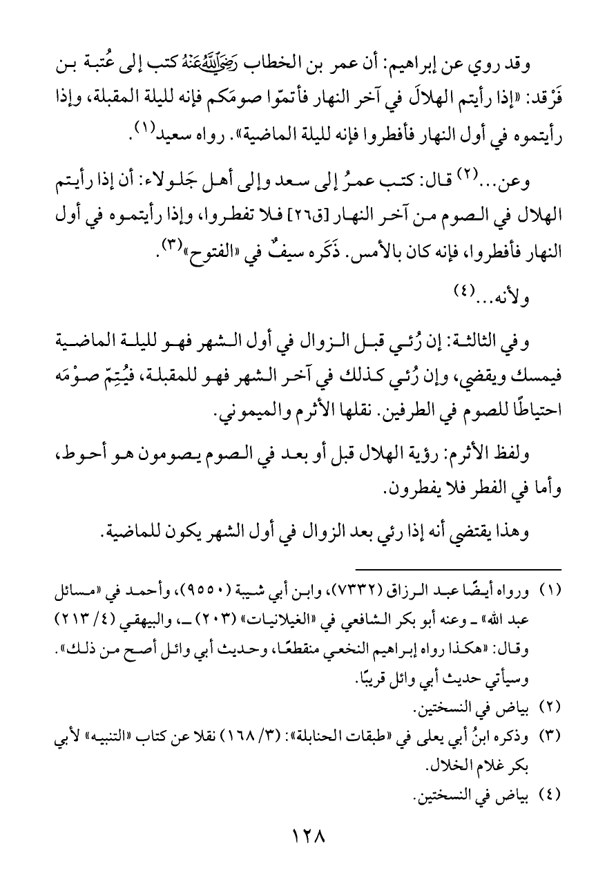 وعن ... (¬٢) قال: كتب عمرُ إلى سعد وإلى أهل جَلولاء: أن إذا رأيتم الهلال في الصوم من آخر النهار [ق ٢٦] فلا تفطروا، وإذا رأيتموه في أول النهار فأفطروا، فإنه كان بالأمس. ذَكَره سيفٌ في «الفتوح» (¬٣).