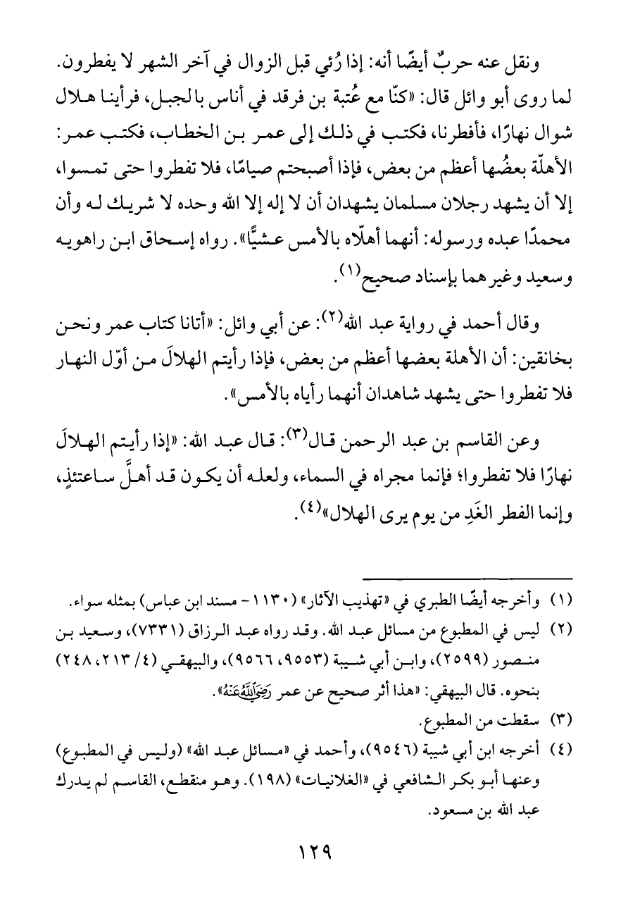 ونقل عنه حربٌ أيضًا أنه: إذا رُئي قبل الزوال في آخر الشهر لا يفطرون. لما روى أبو وائل قال: «كنّا مع عُتبة بن فرقد في أناس بالجبل، فرأينا هلال شوال نهارًا، فأفطرنا، فكتب في ذلك إلى عمر بن الخطاب، فكتب عمر: الأهلّة بعضُها أعظم من بعض، فإذا أصبحتم صيامًا، فلا تفطروا حتى تمسوا، إلا أن يشهد رجلان مسلمان يشهدان أن لا إله إلا الله وحده لا شريك له وأن محمدًا عبده ورسوله: أنهما أهلّاه بالأمس عشيًّا». رواه إسحاق ابن راهويه وسعيد وغيرهما بإسناد صحيح (¬١).