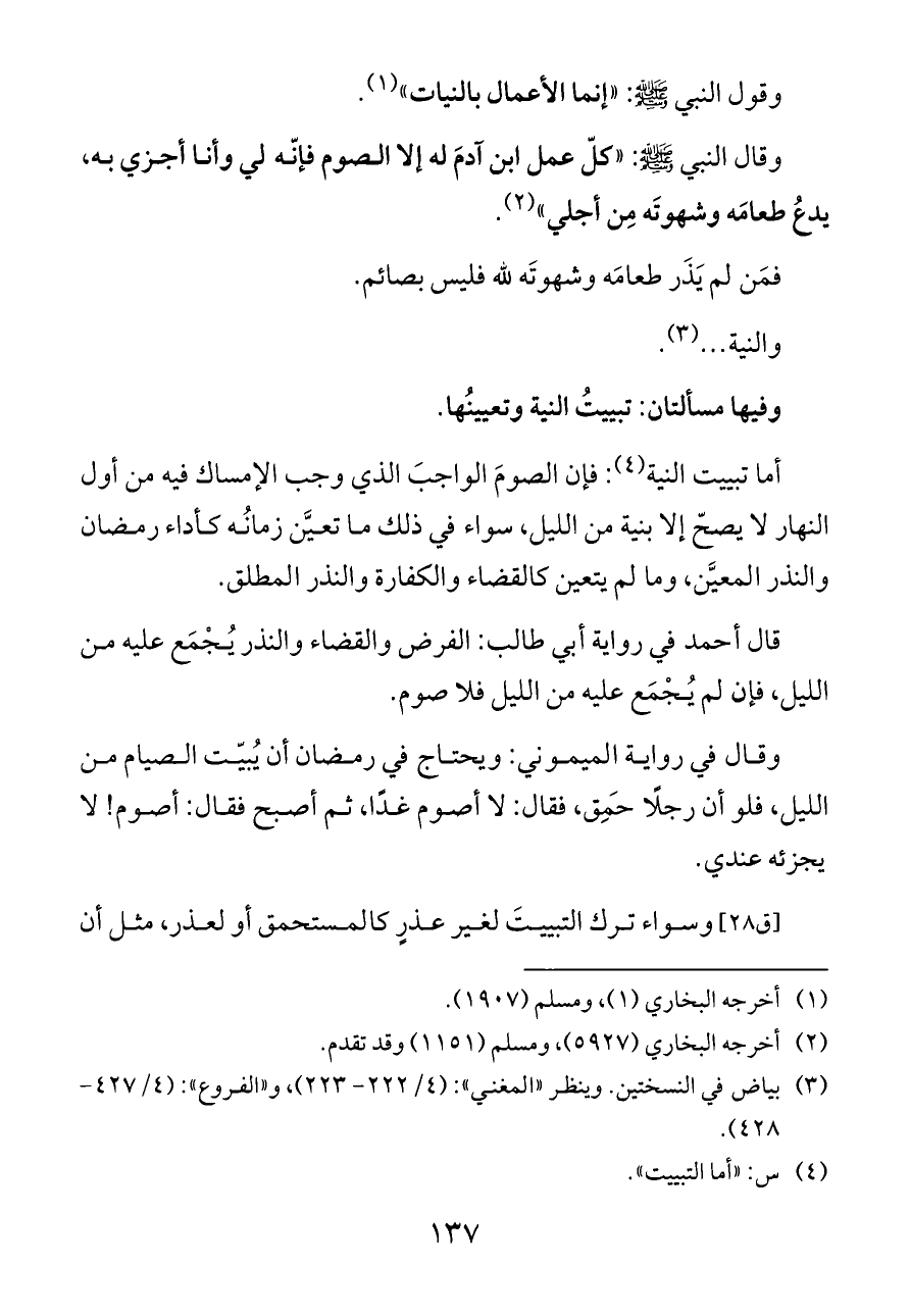 أما تبييت النية (¬٤): فإن الصومَ الواجبَ الذي وجب الإمساك فيه من أول النهار لا يصحّ إلا بنية من الليل، سواء في ذلك ما تعيَّن زمانُه كأداء رمضان والنذر المعيَّن، وما لم يتعين كالقضاء والكفارة والنذر المطلق.