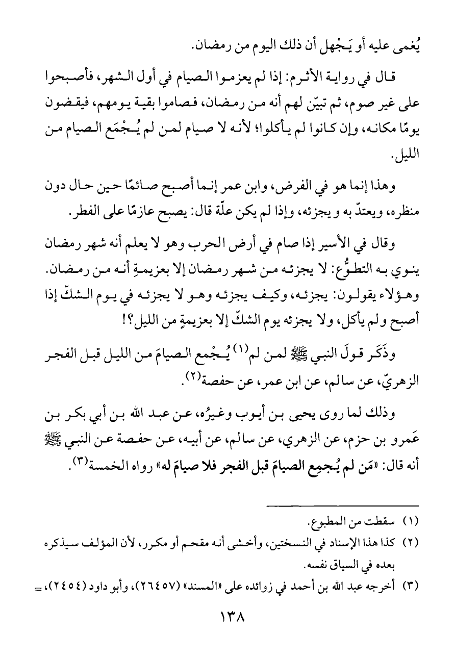 وقال في الأسير إذا صام في أرض الحرب وهو لا يعلم أنه شهر رمضان ينوي به التطوُّع: لا يجزئه من شهر رمضان إلا بعزيمةِ أنه من رمضان. وهؤلاء يقولون: يجزئه، وكيف يجزئه وهو لا يجزئه في يوم الشكّ إذا أصبح ولم يأكل، ولا يجزئه يوم الشكّ إلا بعزيمةٍ من الليل؟!