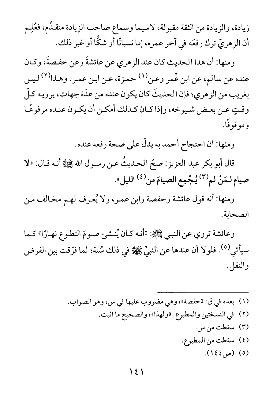 ومنها: أن هذا الحديث كان عند الزهري عن عائشةَ وعن حفصةَ، وكان عنده عن سالم، عن ابن عُمر وعن (¬١) حمزة، عن ابن عمر. وهذا (¬٢) ليس بغريب من الزهري؛ فإن الحديثَ كان يكون عنده من عدّة جهات، يرويه كلّ وقتٍ عن بعض شيوخه، وإذا كان كذلك أمكن أن يكون عنده مرفوعًا وموقوفًا.