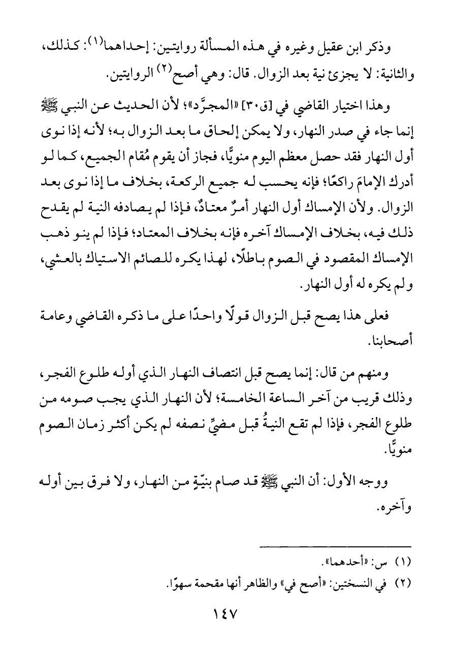 وذكر ابن عقيل وغيره في هذه المسألة روايتين: إحداهما (¬١): كذلك، والثانية: لا يجزئ نية بعد الزوال. قال: وهي أصح (¬٢) الروايتين.