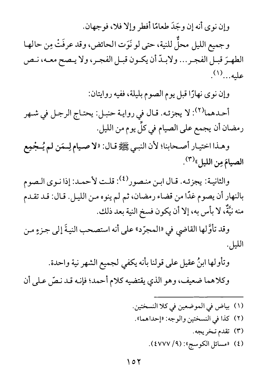 والثانية: يجزئه. قال ابن منصور (¬٤): قلت لأحمد: إذا نوى الصوم بالنهار أن يصوم غدًا من قضاء رمضان، ثم لم ينوه من الليل. قال: قد تقدم منه نيَّةٌ، لا بأس به، إلا أن يكون فسخ النية بعد ذلك.