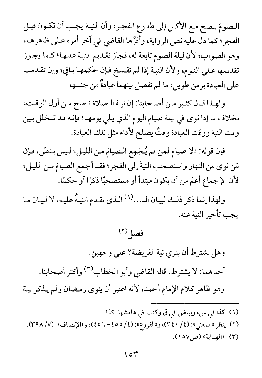 الصومَ يصح مع الأكل إلى طلوع الفجر، وأن النية يجب أن تكون قبل الفجر؛ كما دل عليه نص الرواية، وأقرَّها القاضي في آخر أمره على ظاهرها، وهو الصواب؛ لأن ليلة الصوم تابعة له، فجاز تقديم النية عليها؛ كما يجوز تقديمها على النوم، ولأن النية إذا لم تفسخ فإن حكمها باقٍ؛ وإن تقدمت على العبادة بزمن طويل، ما لم تفصل بينهما عبادةٌ من جنسها.