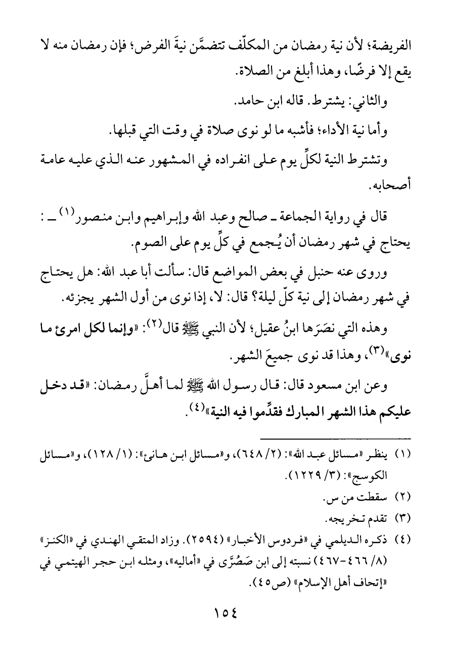 وعن ابن مسعود قال: قال رسول الله - صلى الله عليه وسلم - لما أهلَّ رمضان: «قد دخل عليكم هذا الشهر المبارك فقدِّموا فيه النية» (¬٤).
