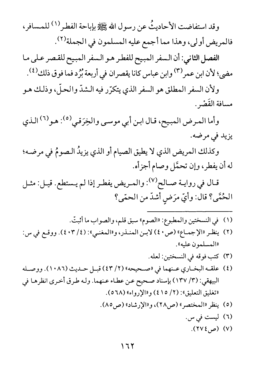 وقد استفاضت الأحاديثُ عن رسول الله - صلى الله عليه وسلم - بإباحة الفطر (¬١) للمسافر، فالمريض أولى، وهذا مما أجمع عليه المسلمون في الجملة (¬٢).