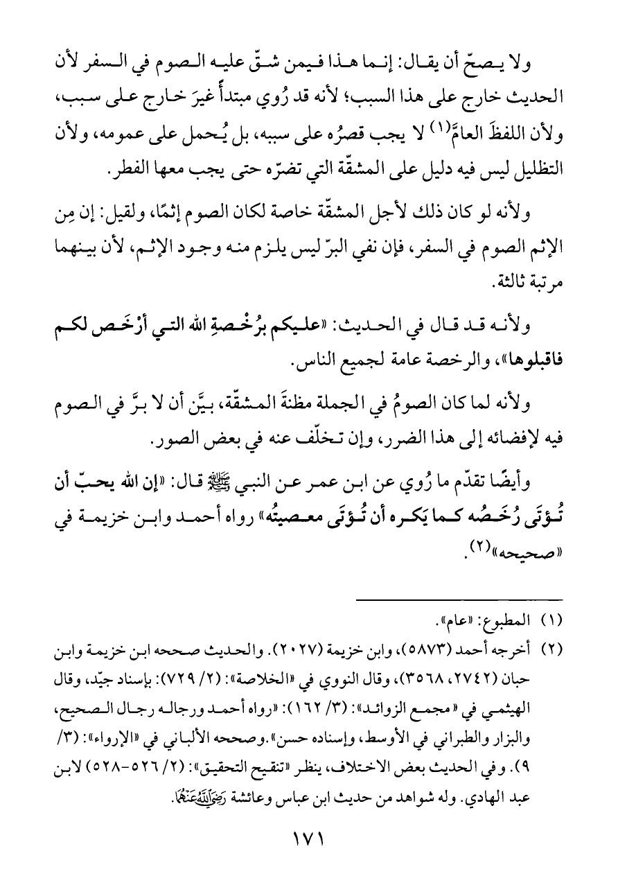 ولأنه لو كان ذلك لأجل المشقّة خاصة لكان الصوم إثمًا، ولقيل: إن مِن الإثم الصوم في السفر، فإن نفي البرّ ليس يلزم منه وجود الإثم، لأن بينهما مرتبة ثالثة.