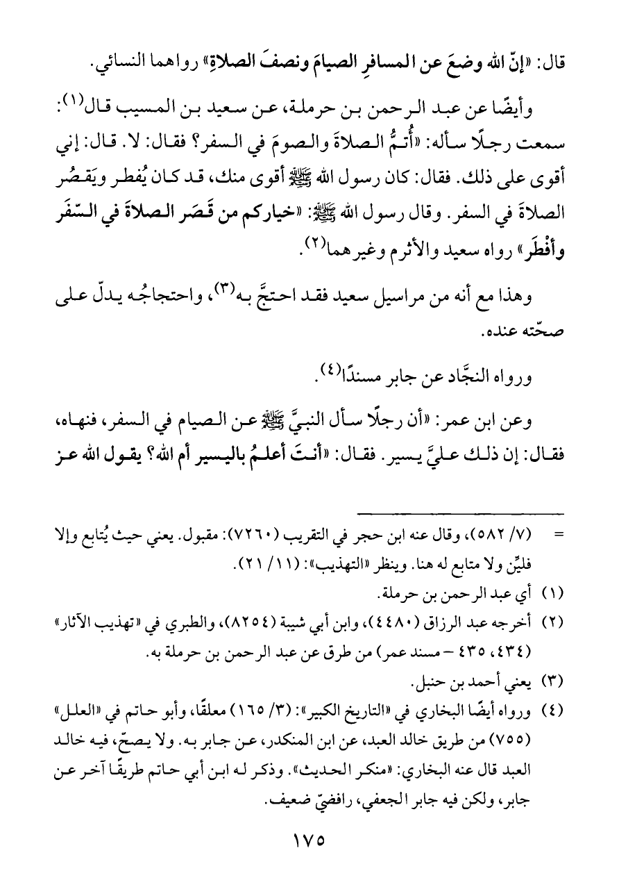 وأيضًا عن عبد الرحمن بن حرملة، عن سعيد بن المسيب قال (¬١): سمعت رجلًا سأله: «أُتمُّ الصلاةَ والصومَ في السفر؟ فقال: لا. قال: إني أقوى على ذلك. فقال: كان رسول الله - صلى الله عليه وسلم - أقوى منك، قد كان يُفطر ويَقصُر الصلاةَ في السفر. وقال رسول الله - صلى الله عليه وسلم -: «خياركم من قَصَر الصلاةَ في السّفَر وأفْطَر» رواه سعيد والأثرم وغيرهما (¬٢).