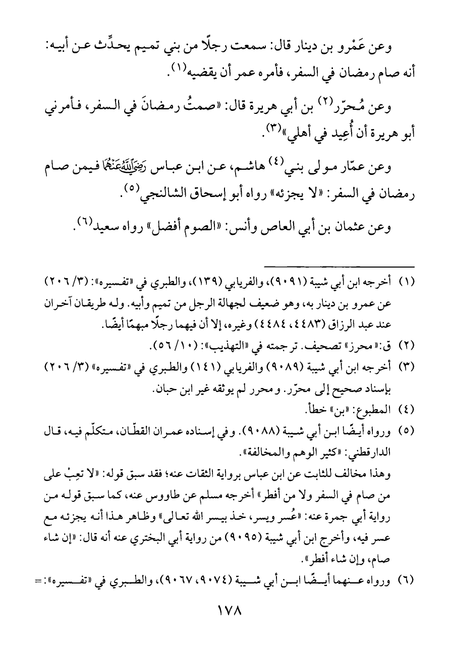 وهذا مخالف للثابت عن ابن عباس برواية الثقات عنه؛ فقد سبق قوله: «لا تعِبْ على من صام في السفر ولا من أفطر» أخرجه مسلم عن طاووس عنه، كما سبق قوله من رواية أبي جمرة عنه: «عُسر ويسر، خذ بيسر الله تعالى» وظاهر هذا أنه يجزئه مع عسر فيه، وأخرج ابن أبي شيبة (٩٠٩٥) من رواية أبي البختري عنه أنه قال: «إن شاء صام، وإن شاء أفطر».