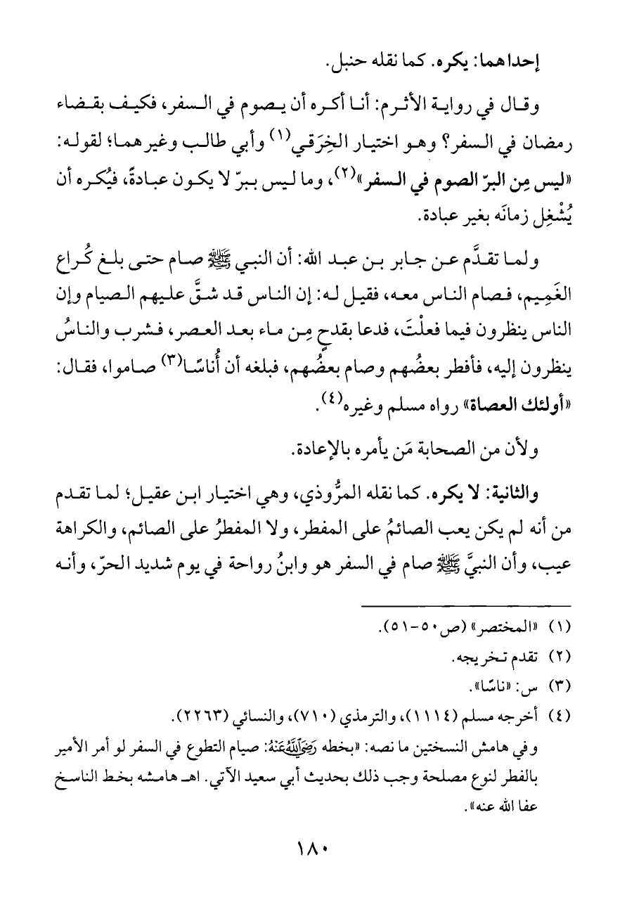 وفي هامش النسختين ما نصه: «بخطه - رضي الله عنه -: صيام التطوع في السفر لو أمر الأمير بالفطر لنوع مصلحة وجب ذلك بحديث أبي سعيد الآتي. اهـ هامشه بخط الناسخ عفا الله عنه».