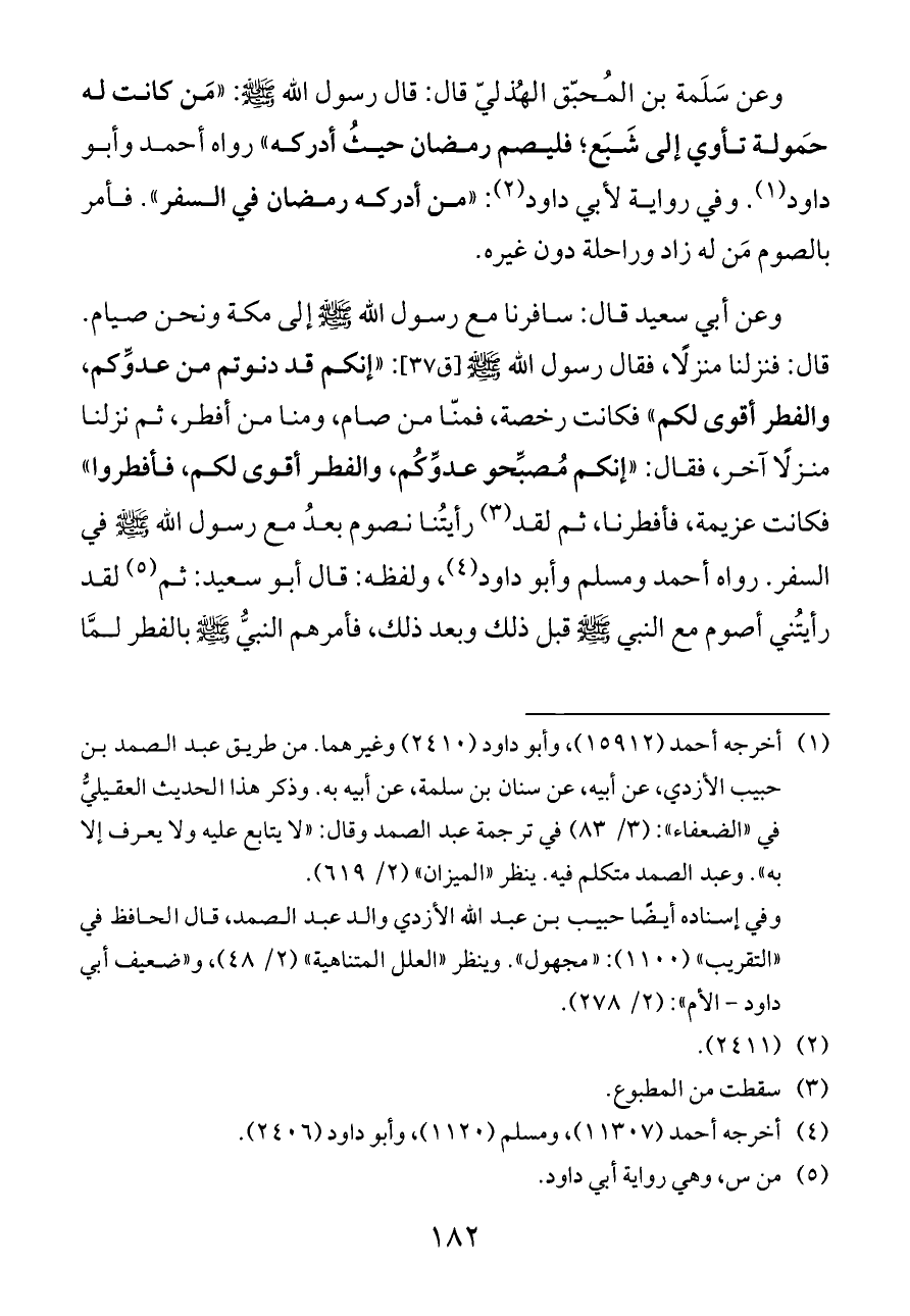وعن أبي سعيد قال: سافرنا مع رسول الله - صلى الله عليه وسلم - إلى مكة ونحن صيام. قال: فنزلنا منزلًا، فقال رسول الله - صلى الله عليه وسلم -[ق ٣٧]: «إنكم قد دنوتم من عدوِّكم، والفطر أقوى لكم» فكانت رخصة، فمنّا من صام، ومنا من أفطر، ثم نزلنا منزلًا آخر، فقال: «إنكم مُصبِّحو عدوِّكُم، والفطر أقوى لكم، فأفطروا» فكانت عزيمة، فأفطرنا، ثم لقد (¬٣) رأيتُنا نصوم بعدُ مع رسول الله - صلى الله عليه وسلم - في السفر. رواه أحمد ومسلم وأبو داود (¬٤)، ولفظه: قال أبو سعيد: ثم (¬٥) لقد رأيتُني أصوم مع النبي - صلى الله عليه وسلم - قبل ذلك وبعد ذلك، فأمرهم النبيُّ - صلى الله عليه وسلم - بالفطر لمَّا