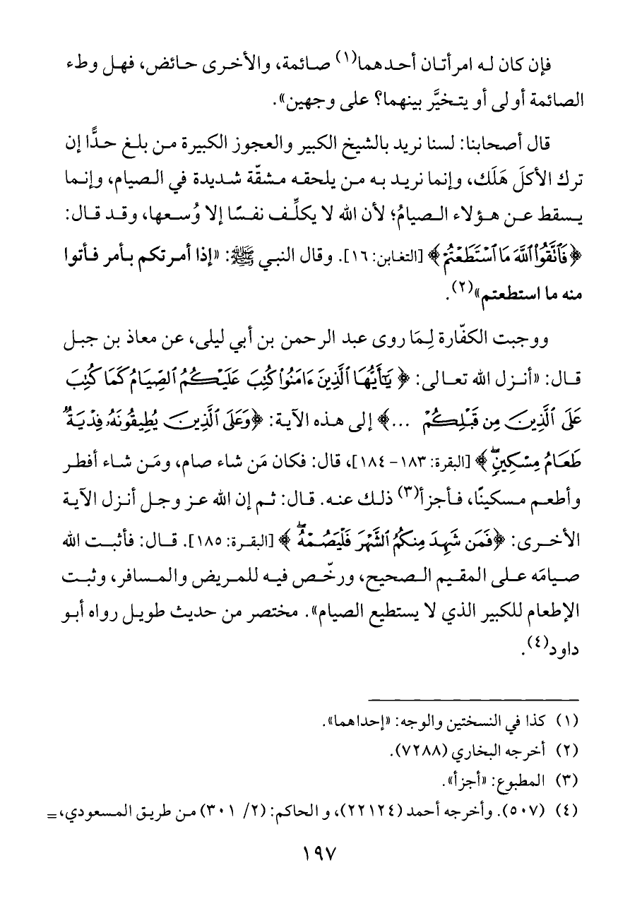 قال أصحابنا: لسنا نريد بالشيخ الكبير والعجوز الكبيرة من بلغ حدًّا إن ترك الأكلَ هَلَك، وإنما نريد به من يلحقه مشقّة شديدة في الصيام، وإنما يسقط عن هؤلاء الصيامُ؛ لأن الله لا يكلِّف نفسًا إلا وُسعها، وقد قال: {فَاتَّقُوا اللَّهَ مَا اسْتَطَعْتُمْ} [التغابن: ١٦]. وقال النبي - صلى الله عليه وسلم -: «إذا أمرتكم بأمر فأتوا منه ما استطعتم» (¬٢).